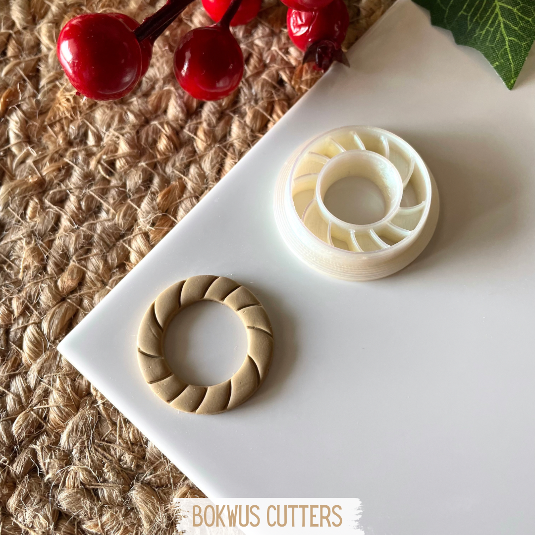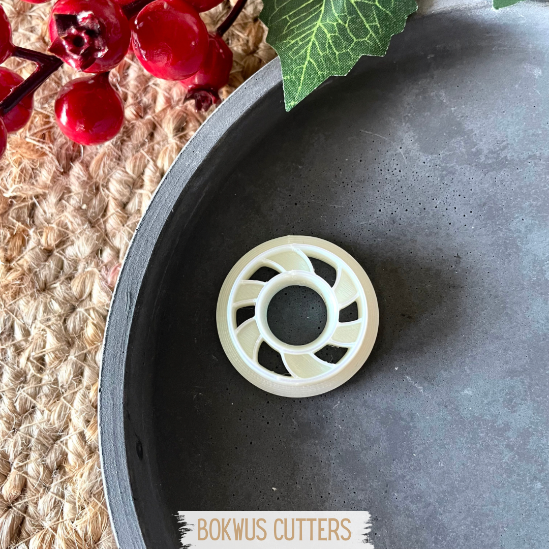 • Cortador circular branco com design espiral dentro de recipiente metálico cinzento com decoração de plantas e tecido trançado