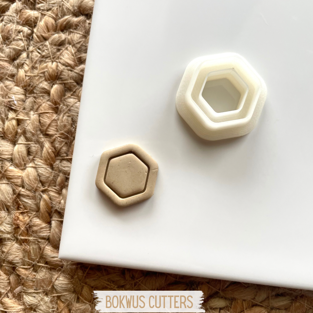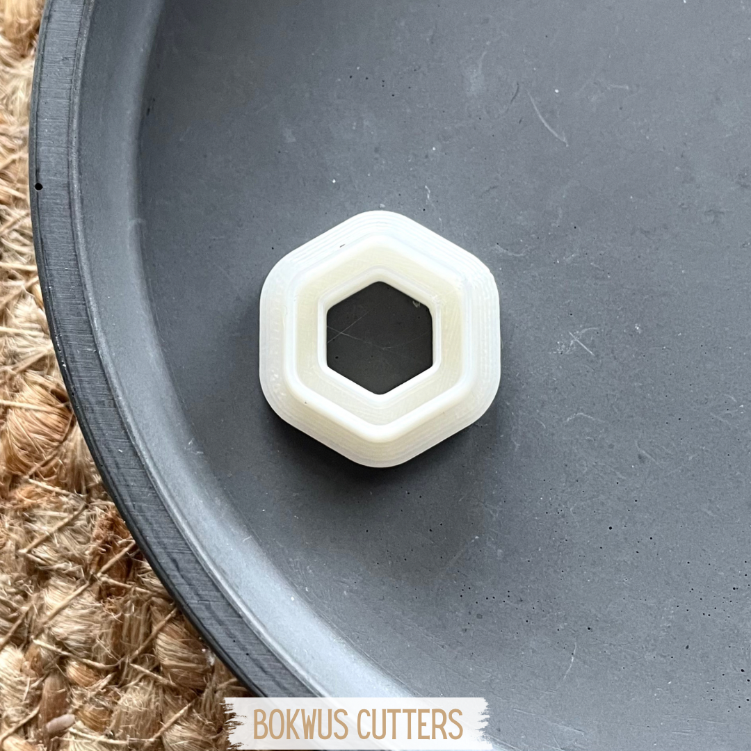 • Cortadores hexagonais em bege e branco sobre superfície branca e juta