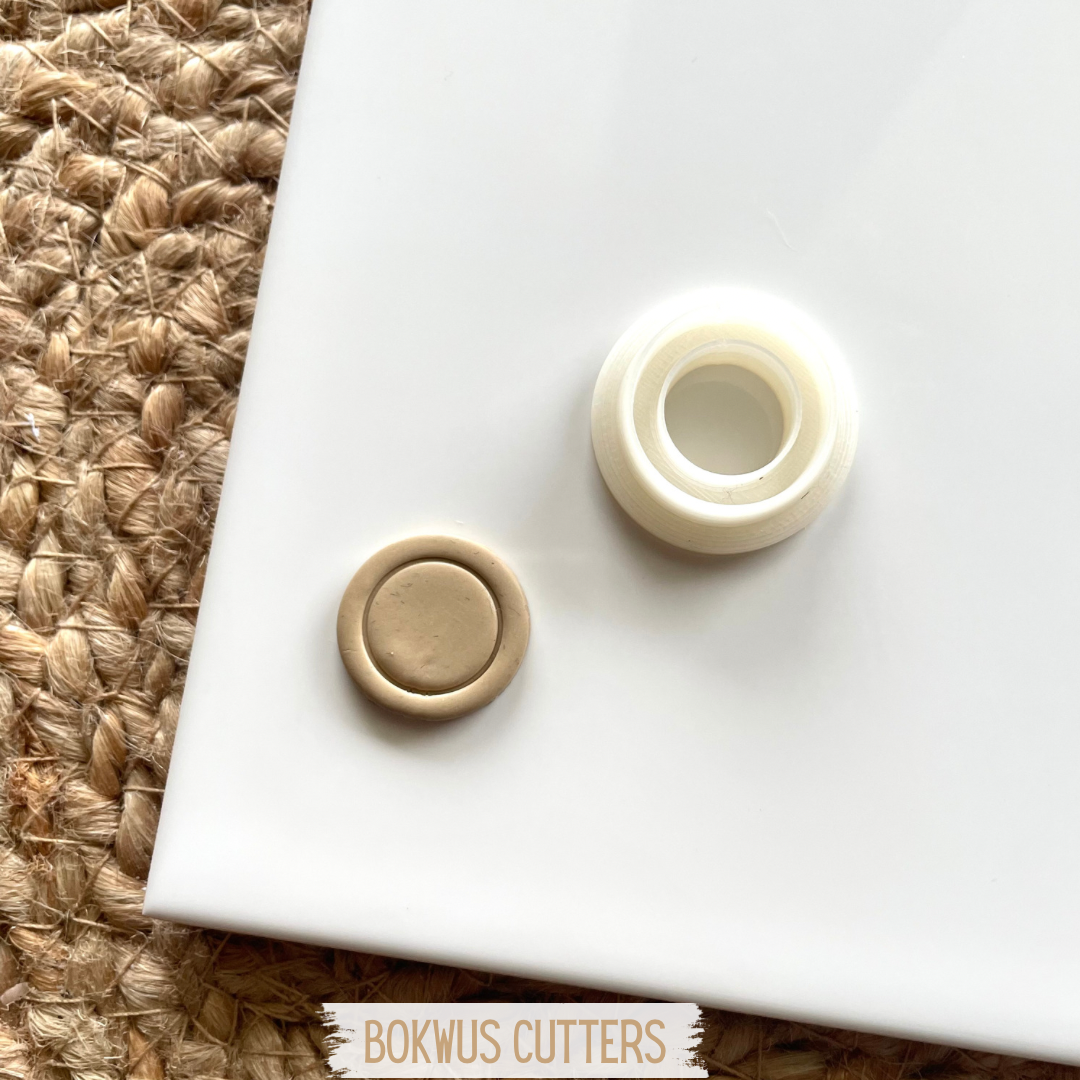 • Duas peças redondas, uma bege e outra branca, sobre superfície branca com fundo em corda trançada e texto BOKWUS CUTTERS