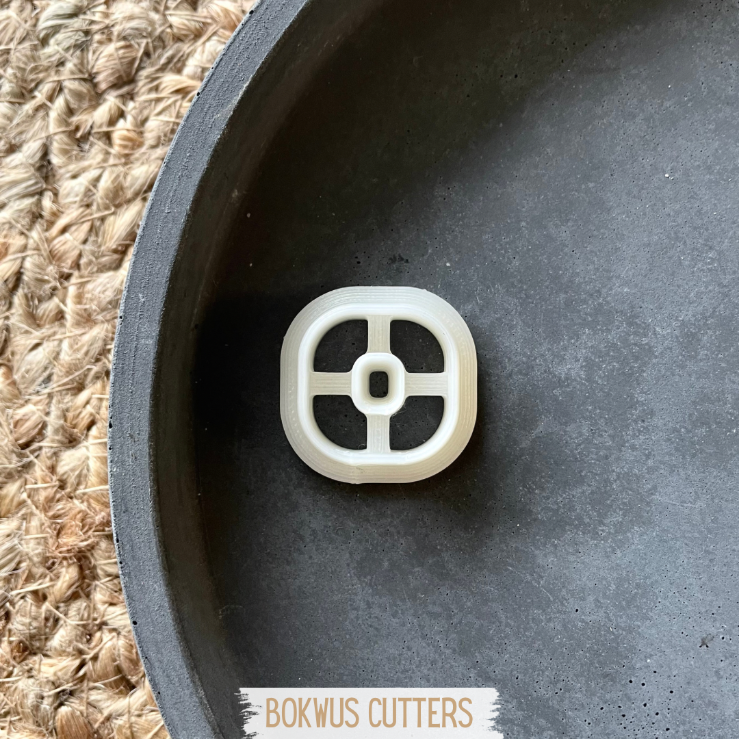 Cortador de massa quadrado branco com cruz numa base preta sobre esteira natural.