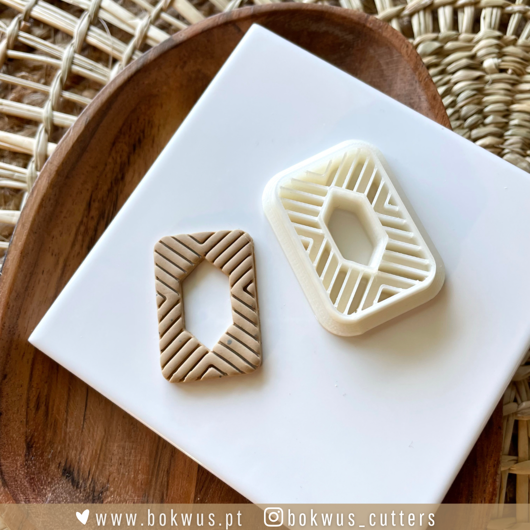• Cortador de plástico branco com padrão geométrico e impressão em cortador em madeira sobre prato branco e tabuleiro de madeira