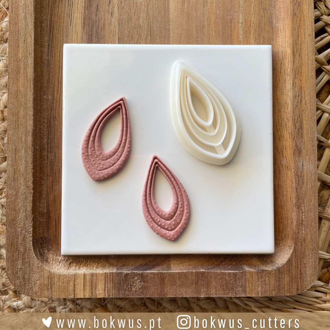 • Três cortadores de tecido em forma de gota sobre placa branca num tabuleiro de madeira.