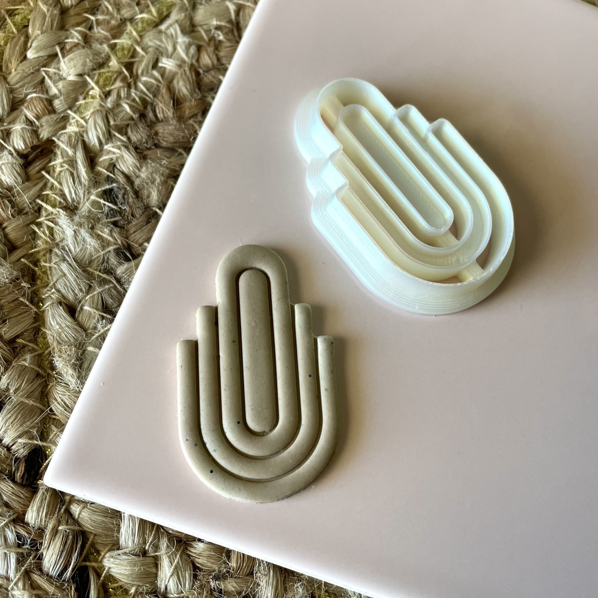 • Dois ímanes em forma de mão Hamsá em bege e branco sobre superfície rosa com tapete trançado ao lado