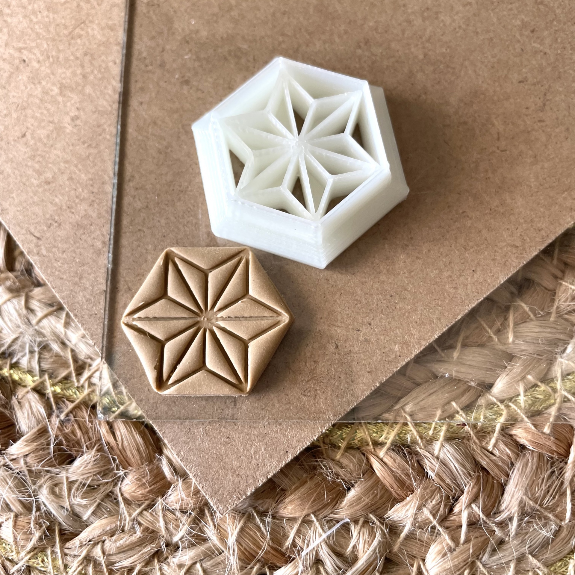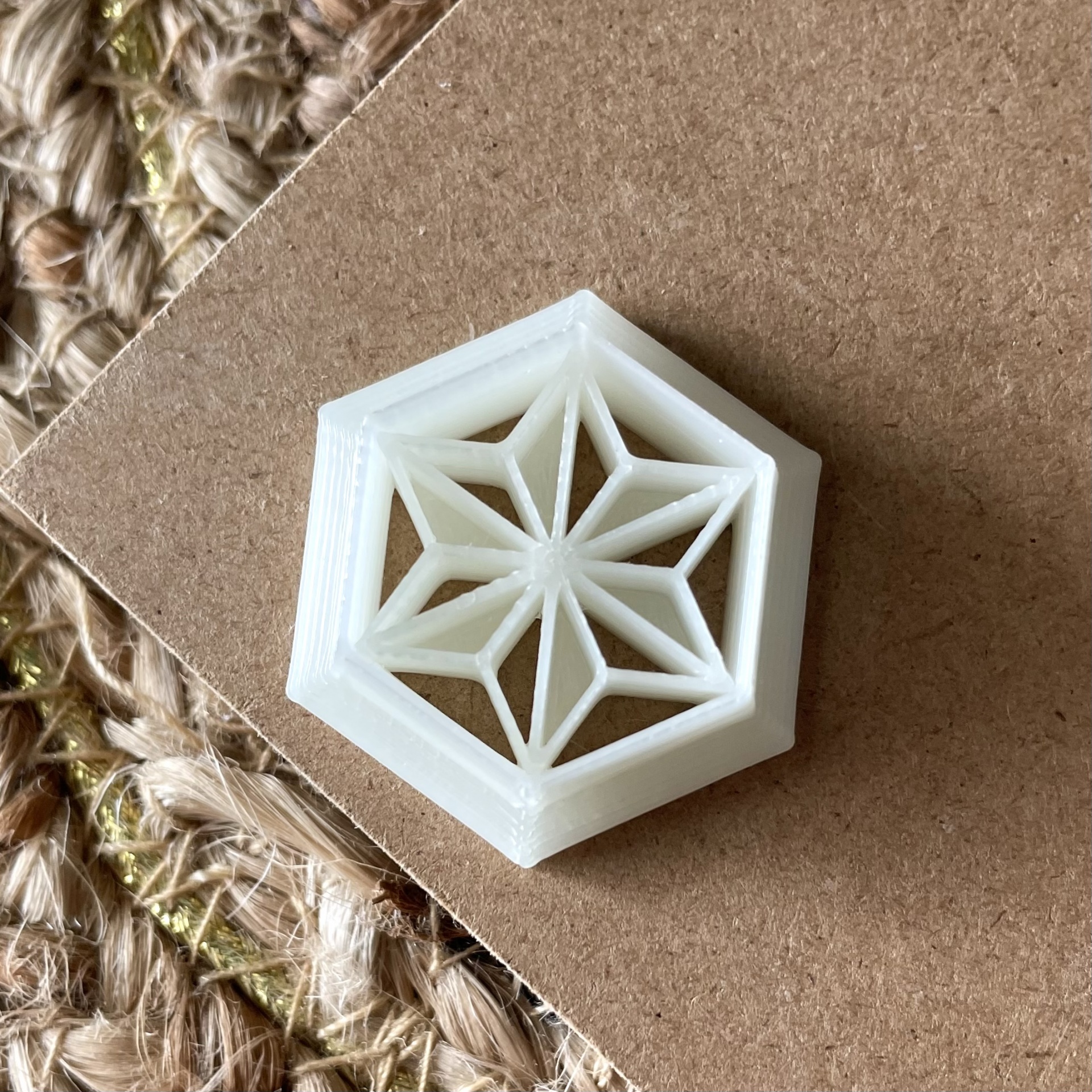 • Objeto hexagonal branco com padrão geométrico em cartão castanho sobre tapete de juta