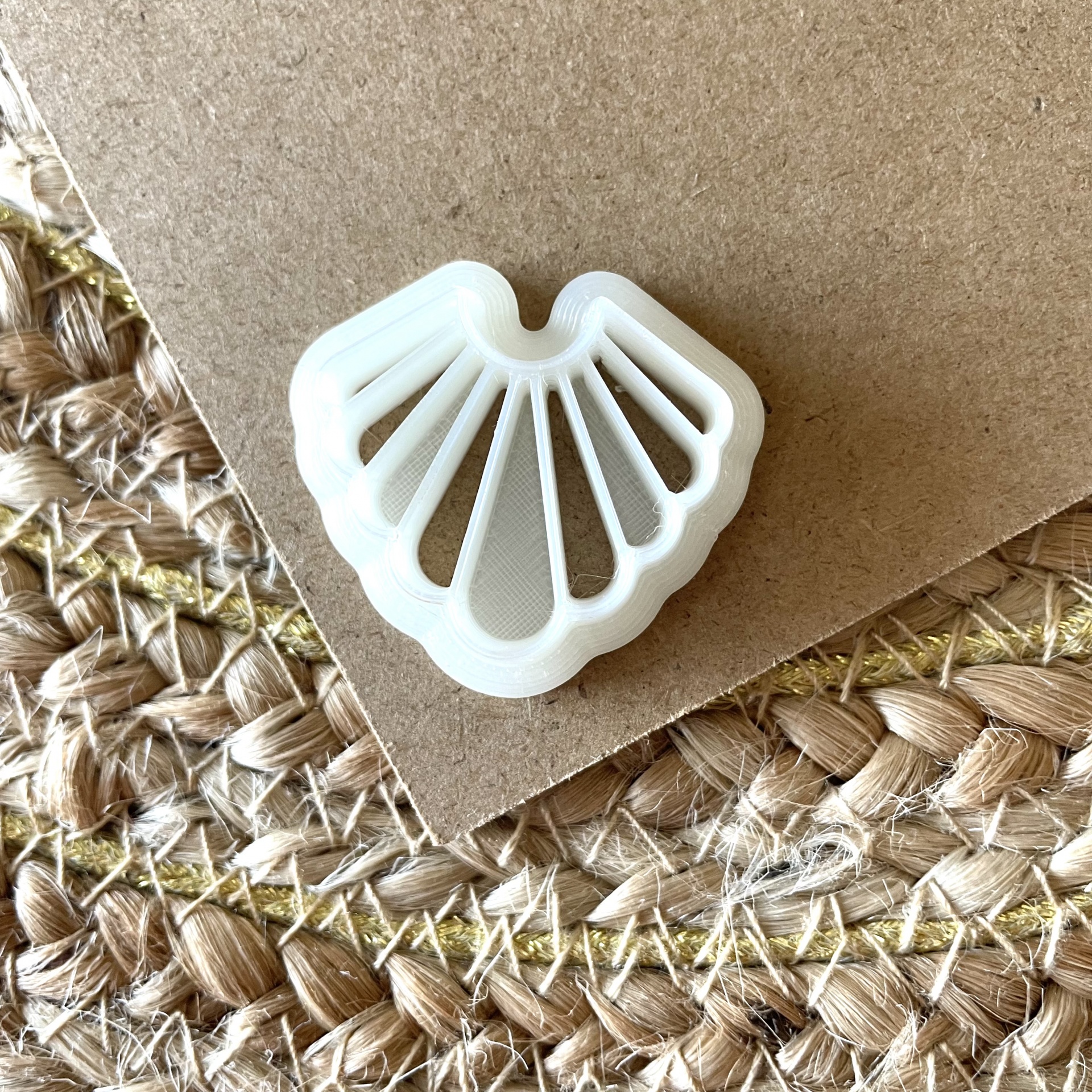• Moldura branca em plástico em forma de concha sobre papel castanho e tapete trançado