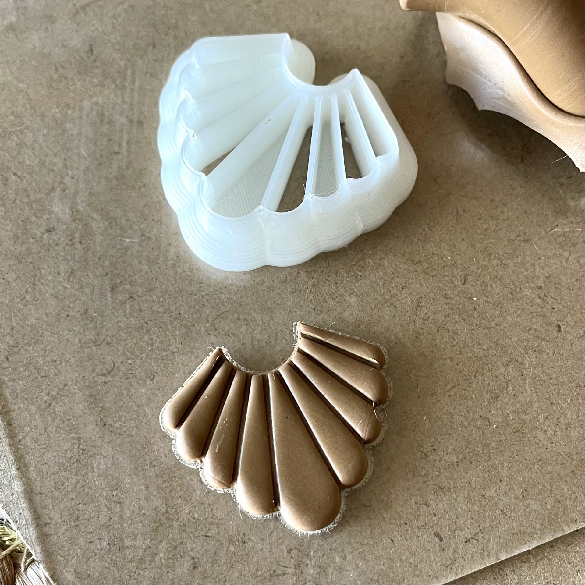 • Forma de silicone branca e peça de couro bege com padrão em ventoinha sobre cartão marron