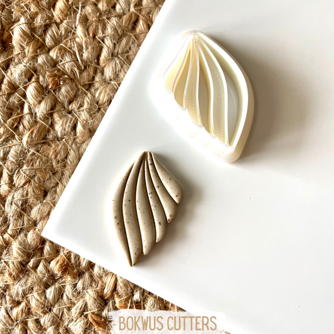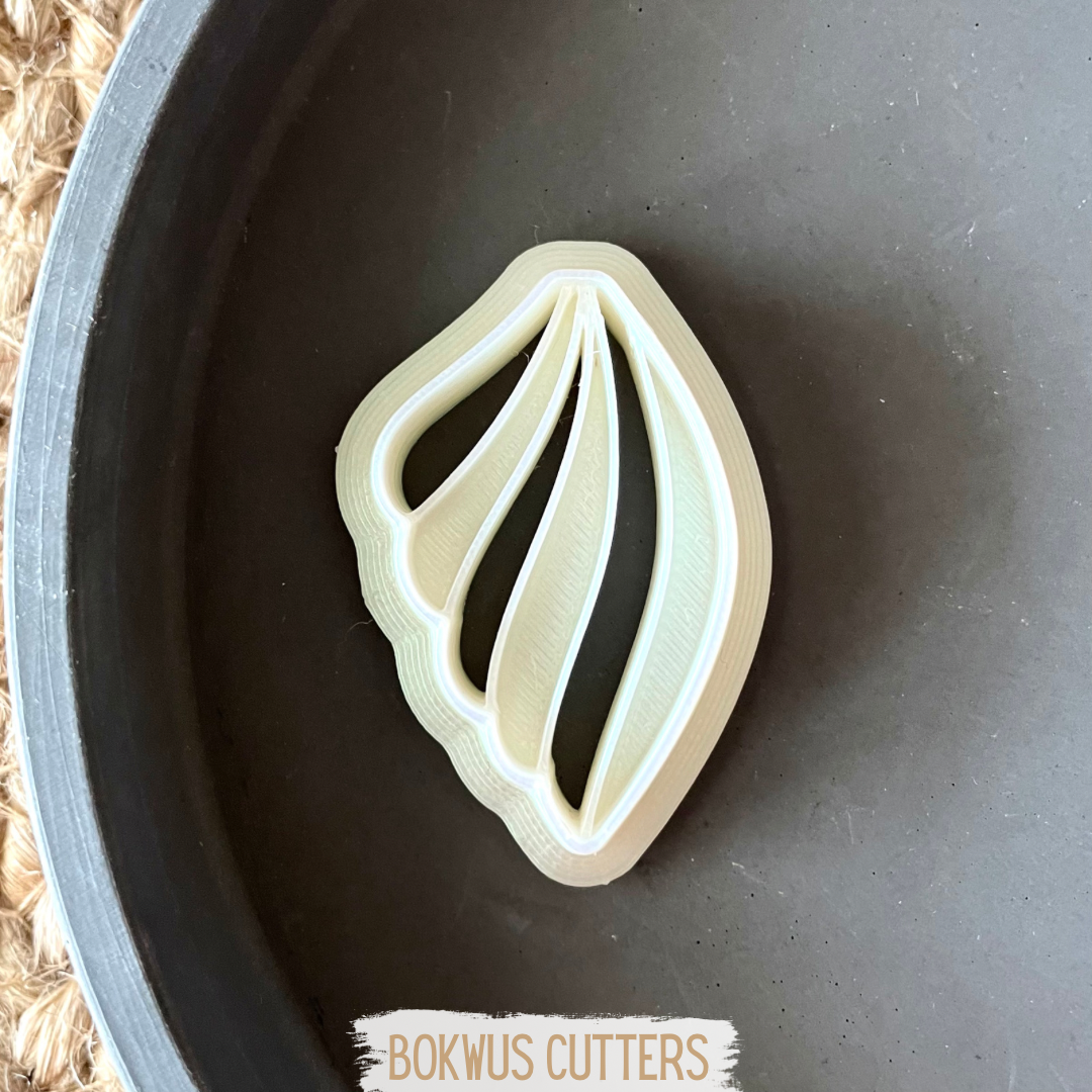 • Cortante de plástico branco em formato de folha dentro de prato cinza com texto BOKWUS CUTTERS