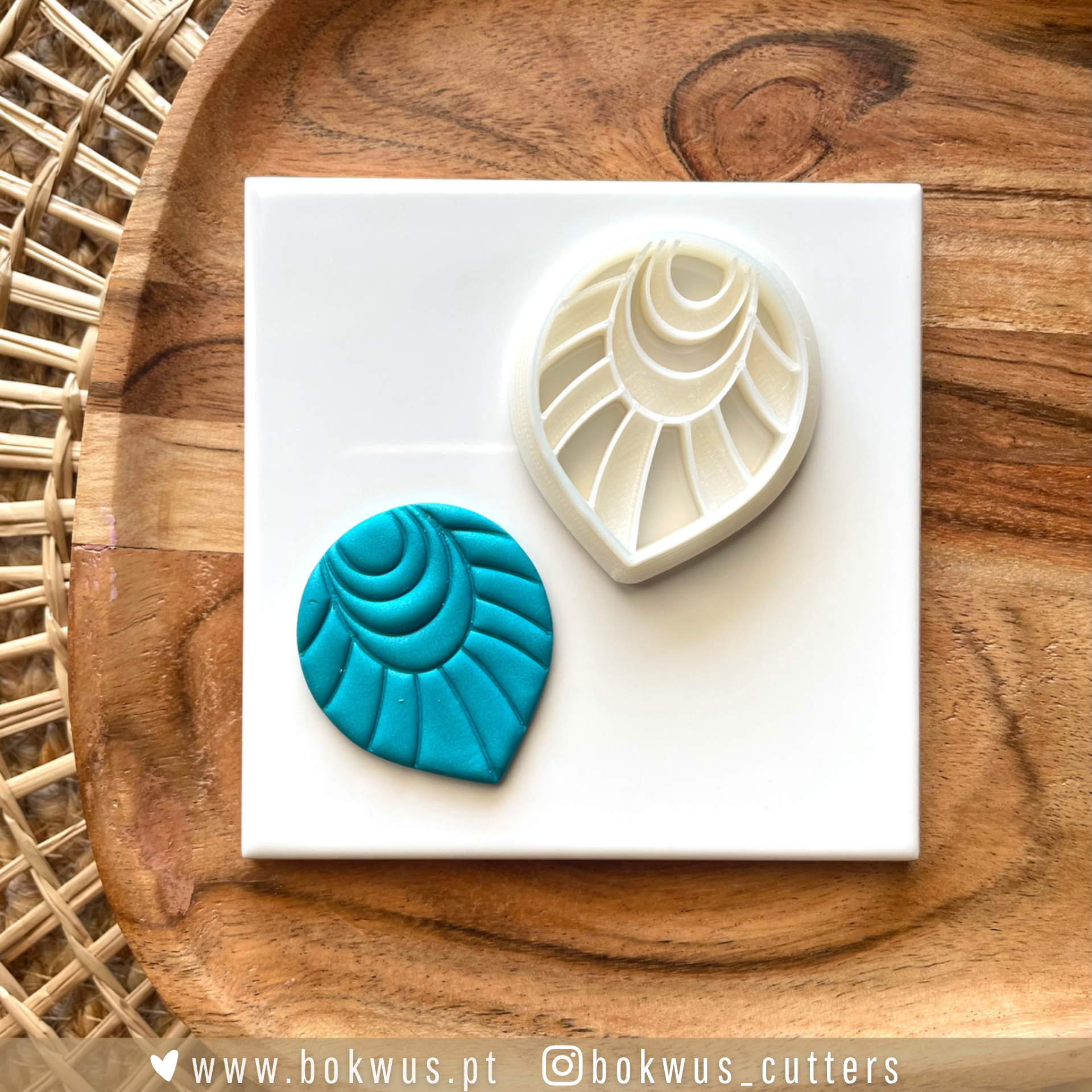 • Cortador branco de pasta de polímero e peça azul com padrão de folha sobre uma placa branca e fundo de madeira com tapete de palha.