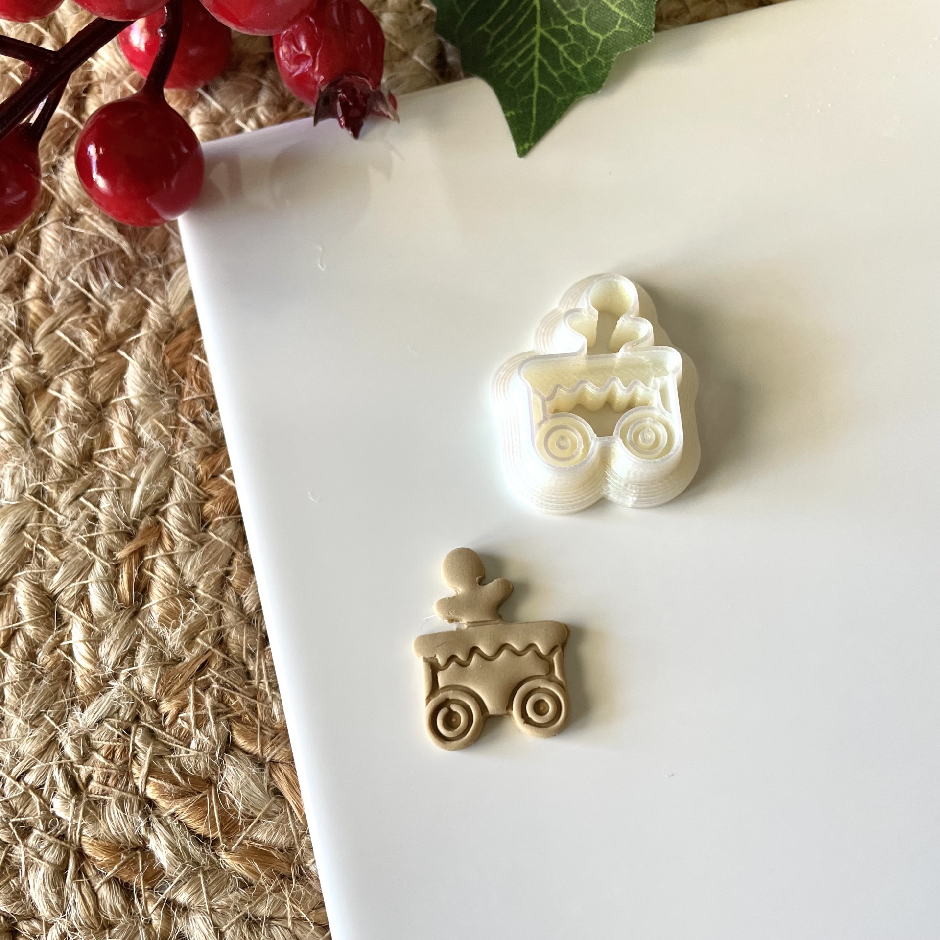 • Carimbo e impressão de carrinho com boneco sobre superfície branca com textura de juta e bagas vermelhas