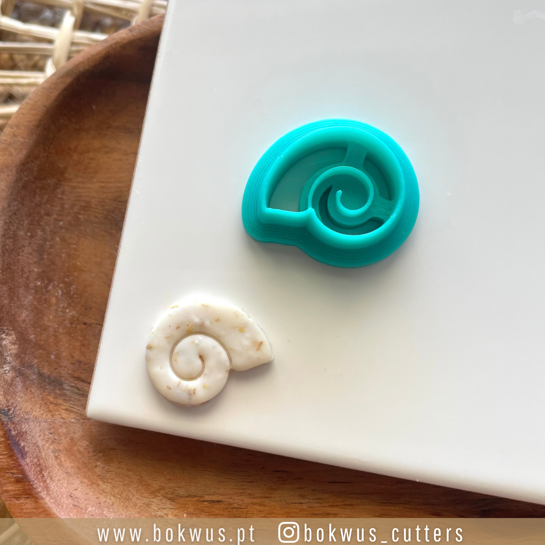 • Cortador de biscoitos azul em forma de caracol com biscoito branco correspondente sobre superfície branca