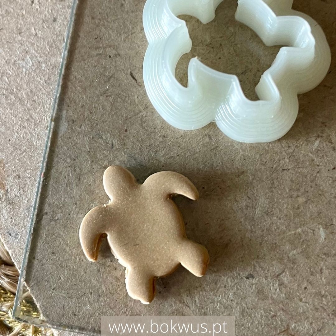 • Cortante de massa branco em forma de tartaruga e bolacha moldada em bege claro sobre superfície castanho clara