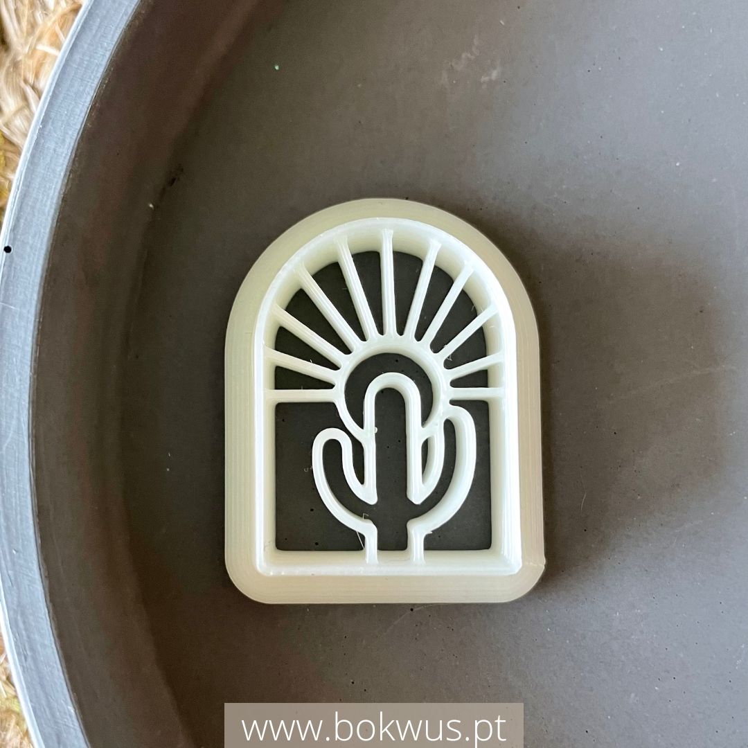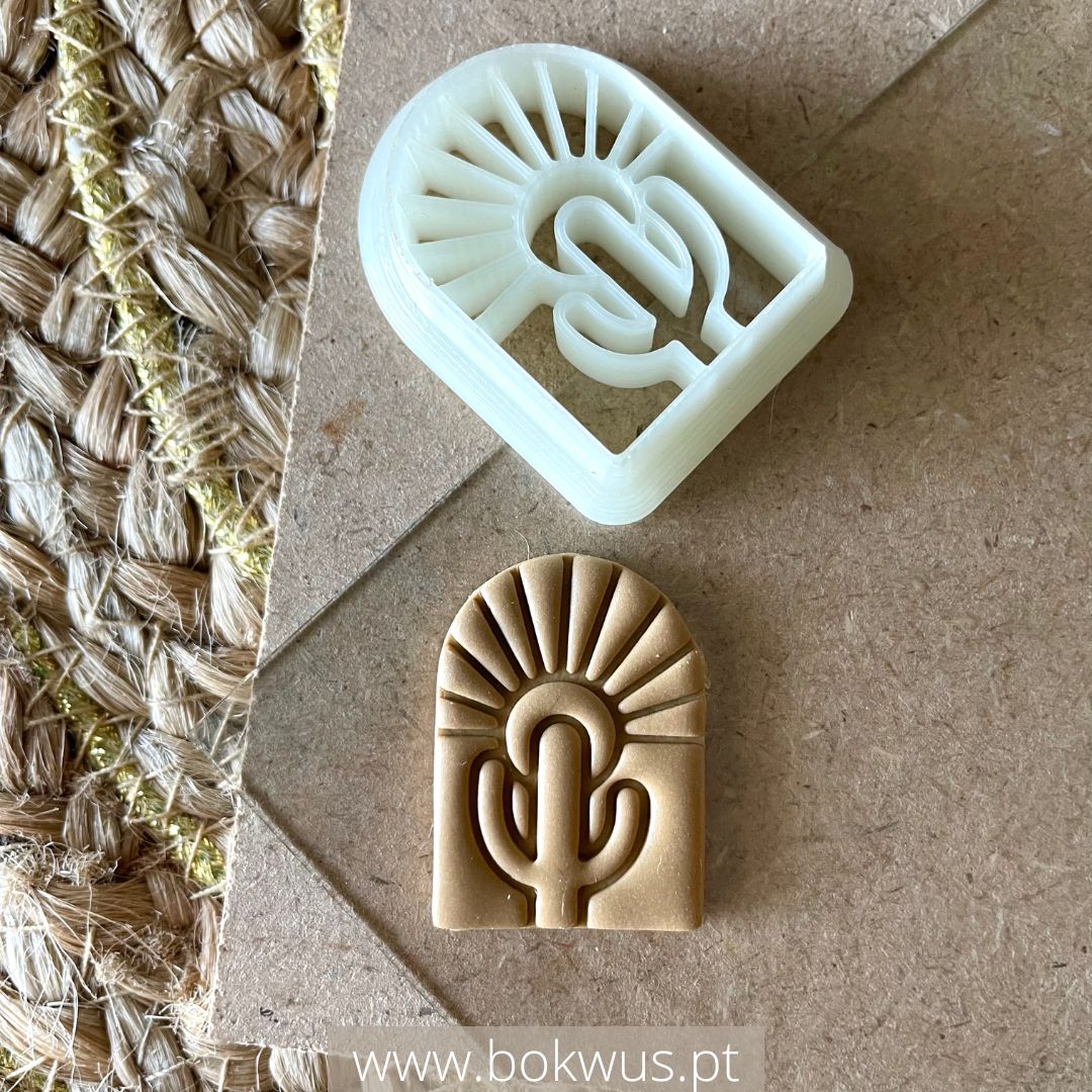 • Molde silicone branco e resina castanha com design cacto em arco-íris sobre fundo terra e juta