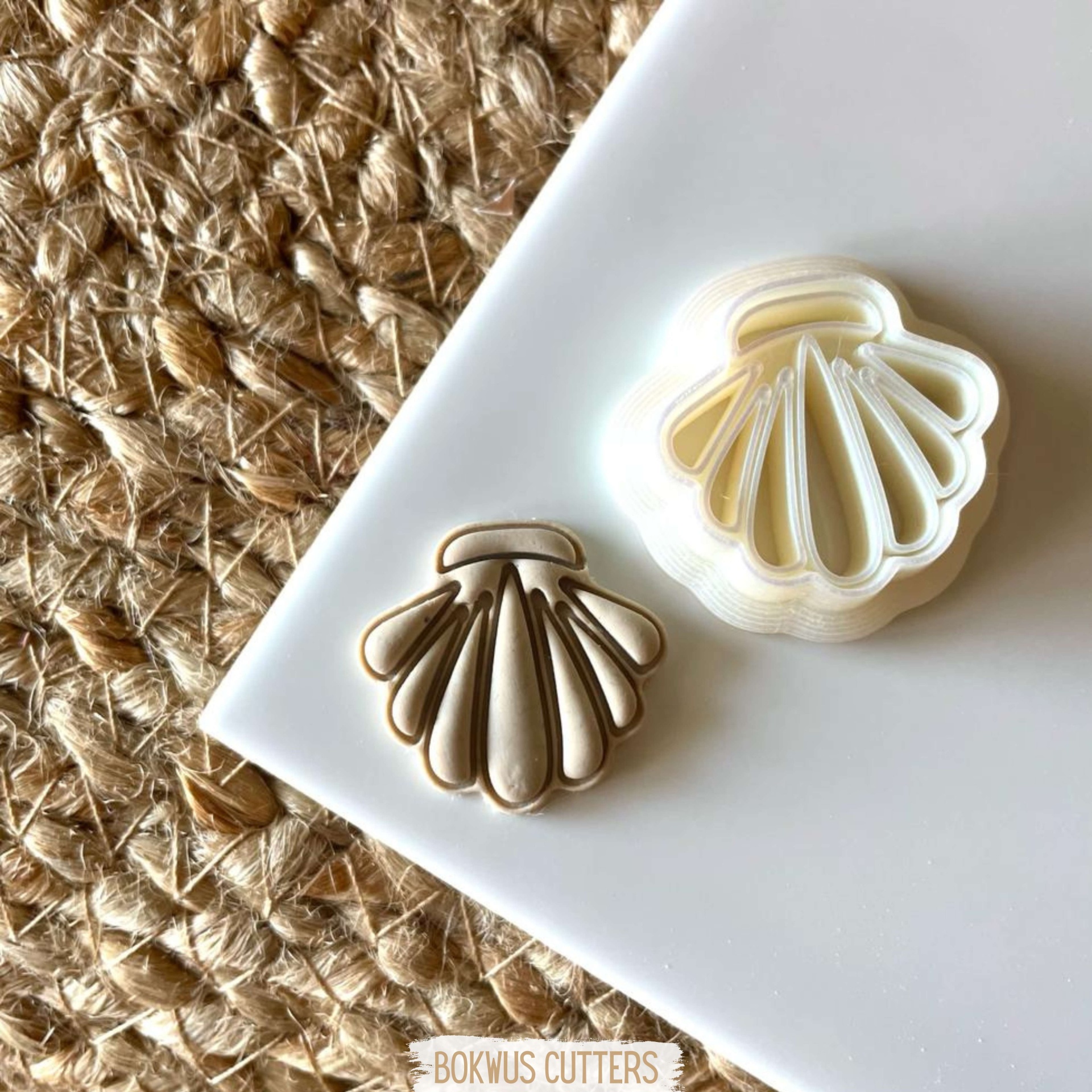 • Cortador de biscoitos concha e massa modelada sobre superfície branca e tapete de fibra natural