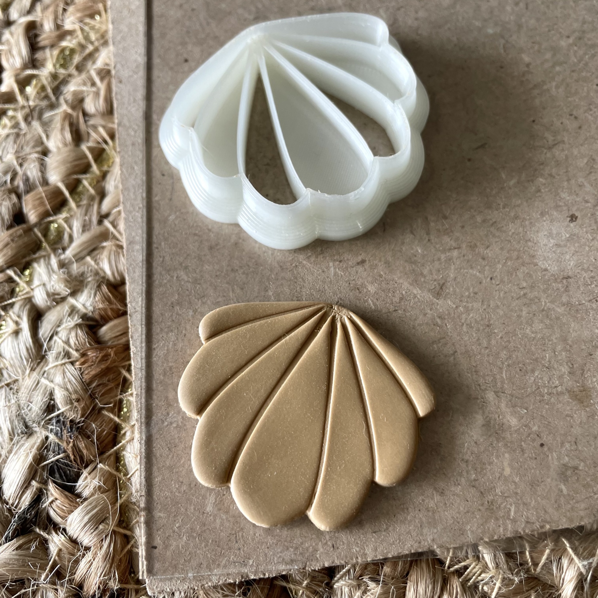 • Cortador de biscoitos branco em forma de concha e massa dourada moldada semelhante sobre superfície castanho clara