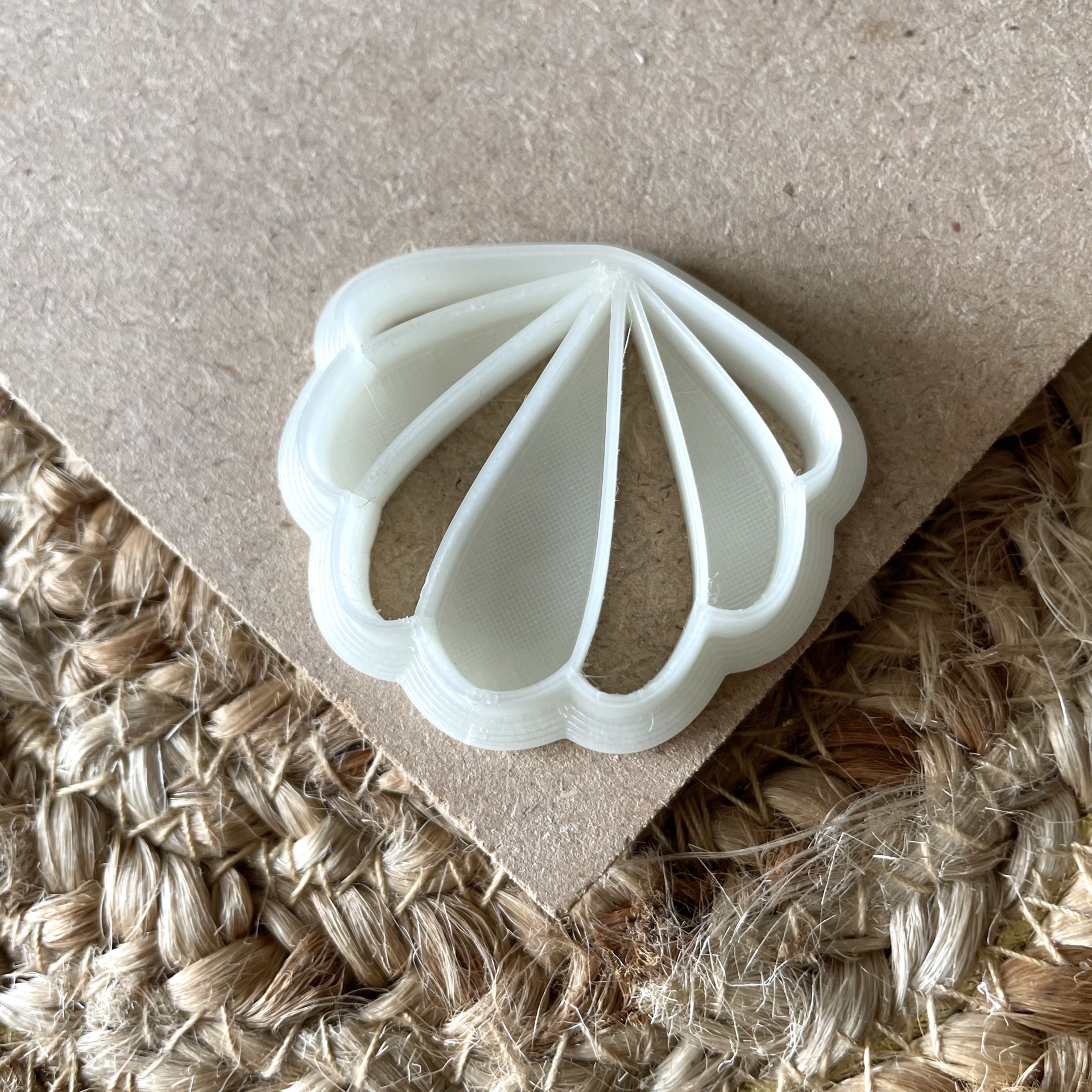 • Cortador de bolacha em forma de concha branco sobre cartão e tapete de fibras naturais