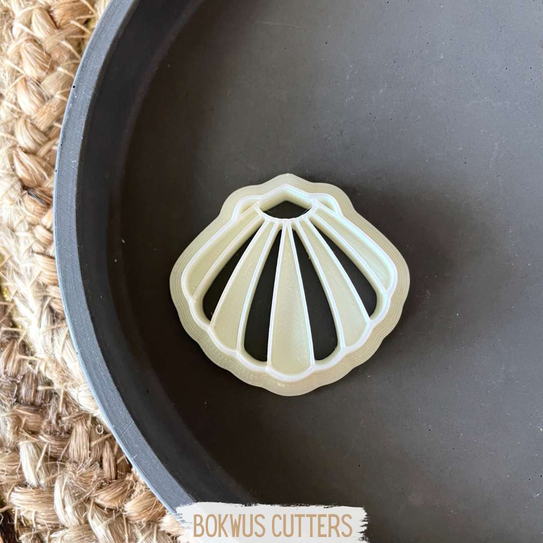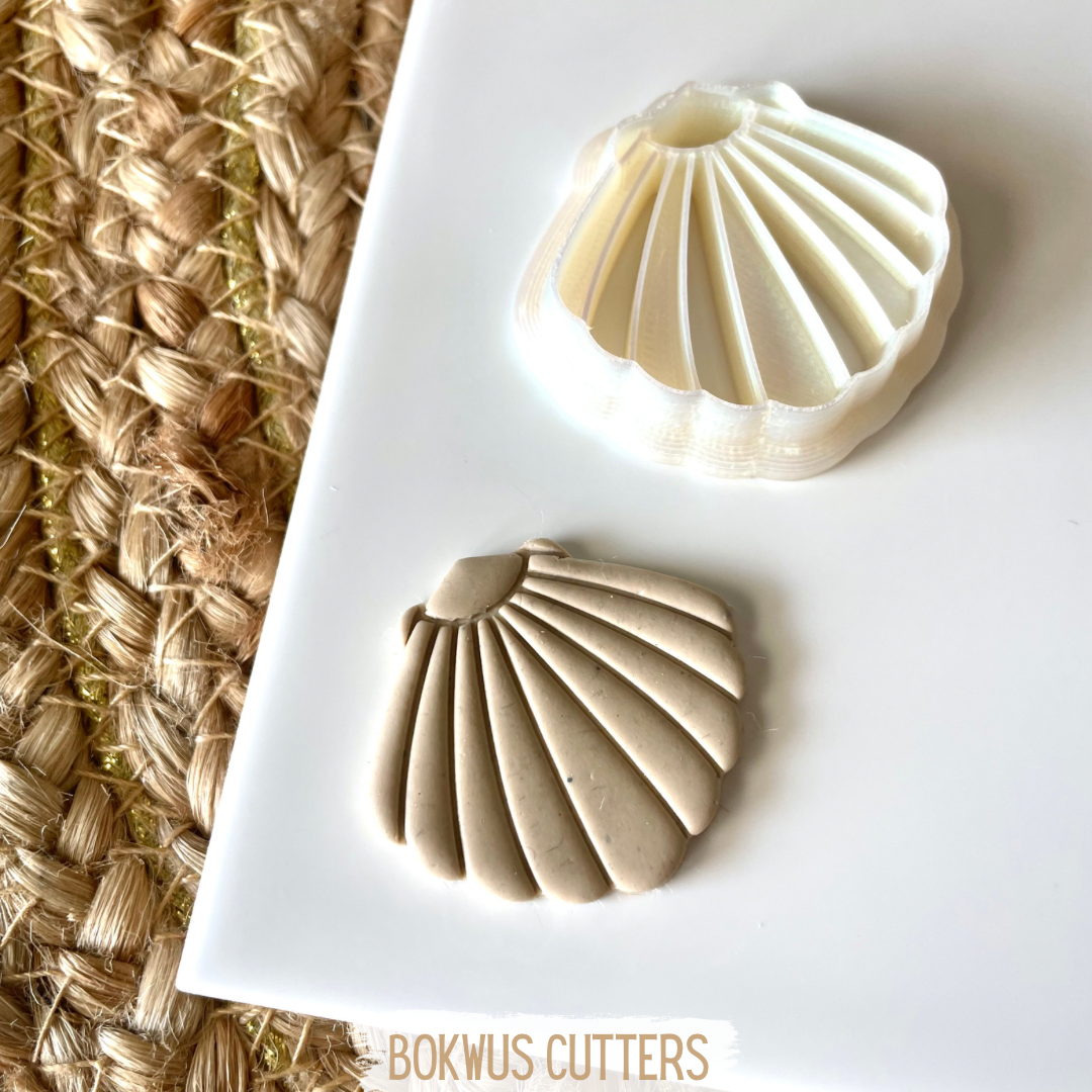• Molde branco em plástico e molde em argila em formato de concha sobre fundo branco e tapete de fibras naturais