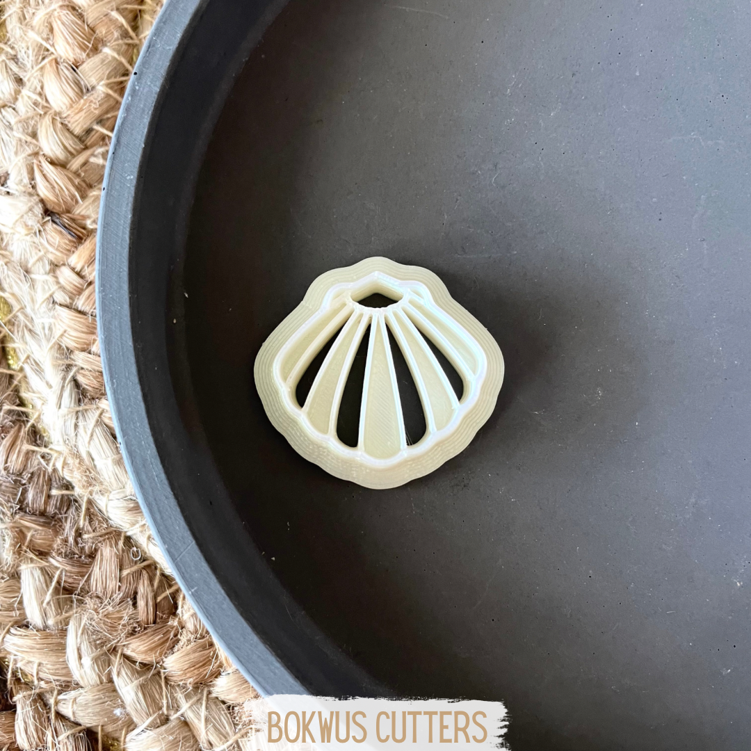 • Cortadores de massa em forma de concha em prato branco sobre superfície de fibra natural com texto BOKWUS CUTTERS