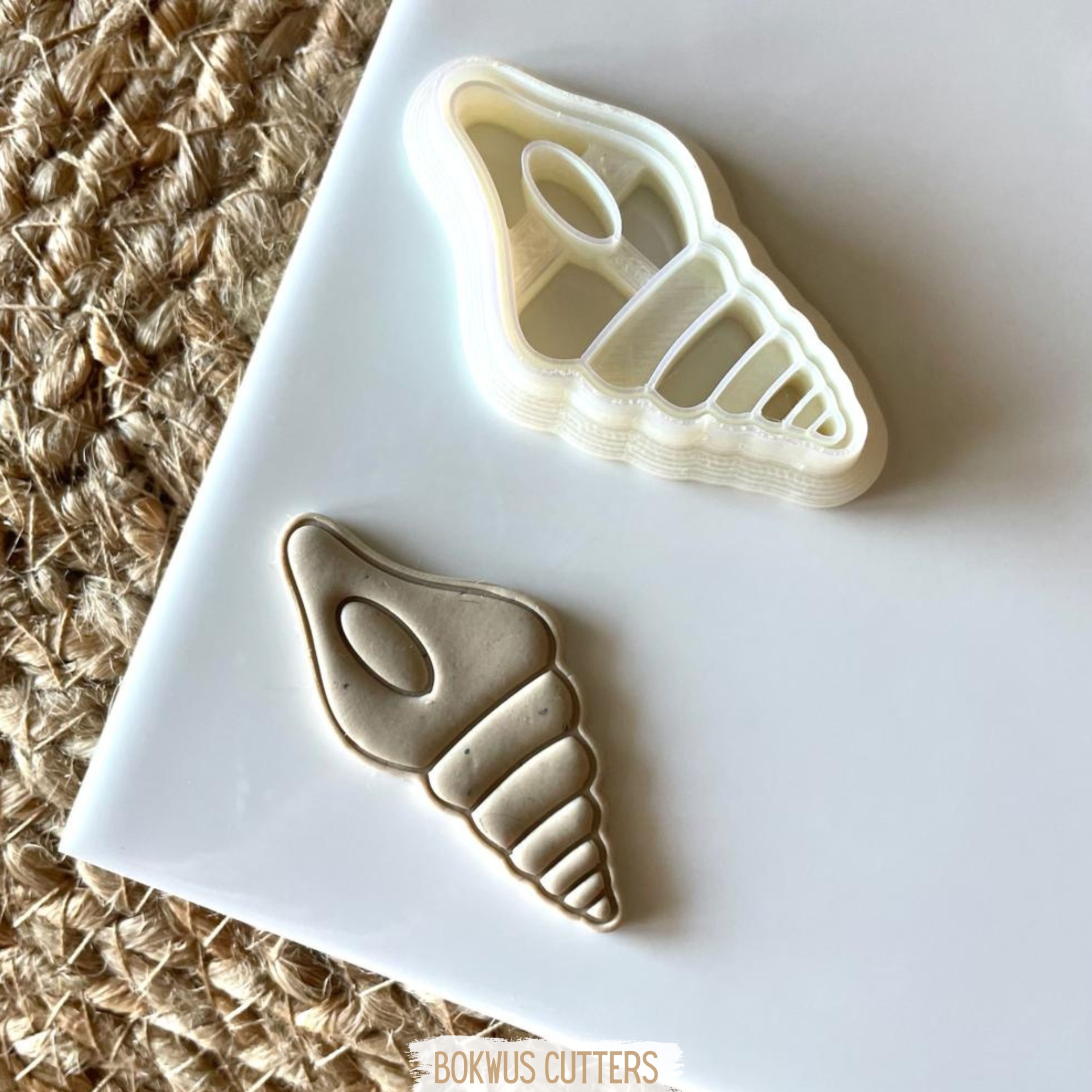 • Cortadores de massa em forma de concha em plástico branco sobre superfície branca e fundo de ráfia.