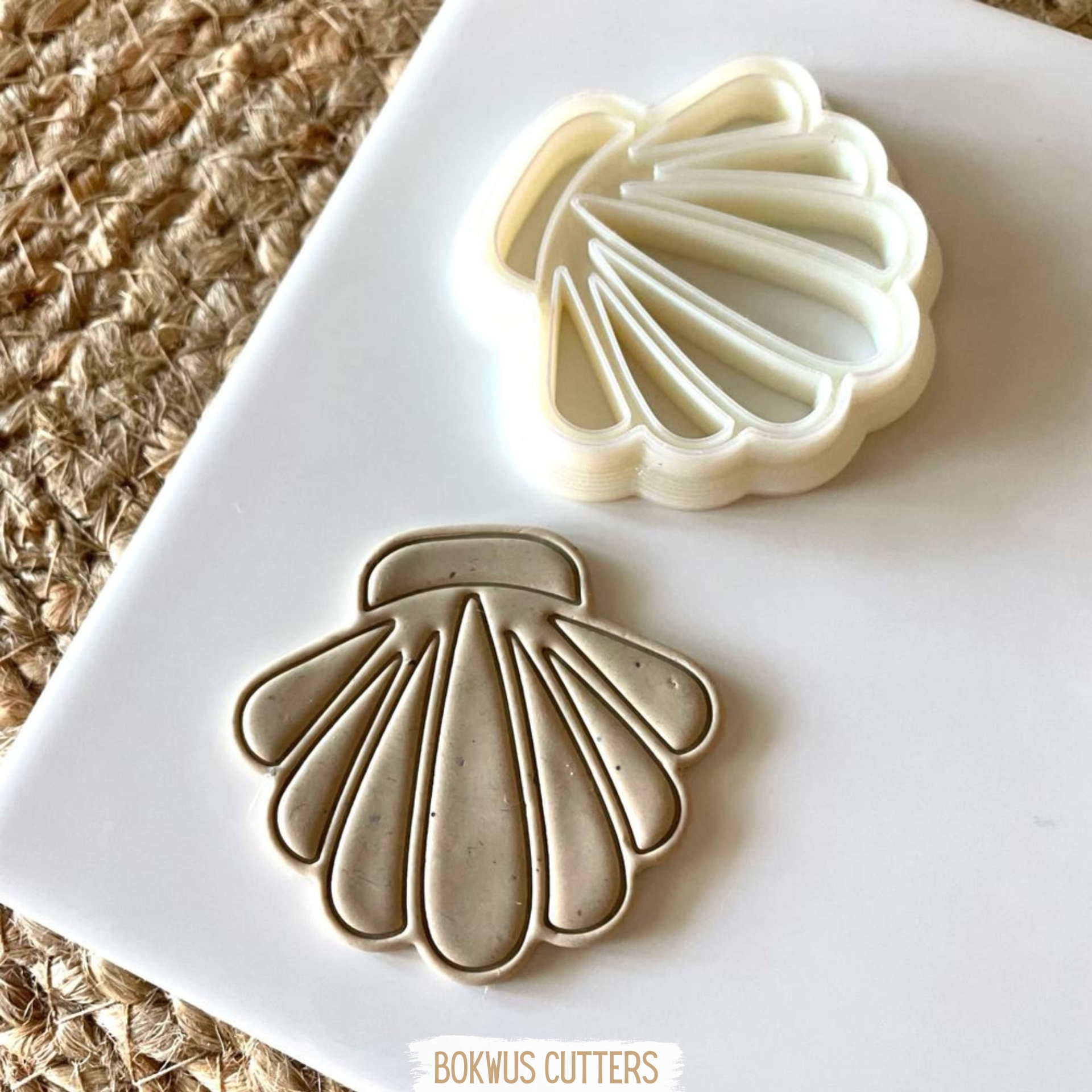 • Cortador de biscoitos em forma de concha branco sobre prato cinzento