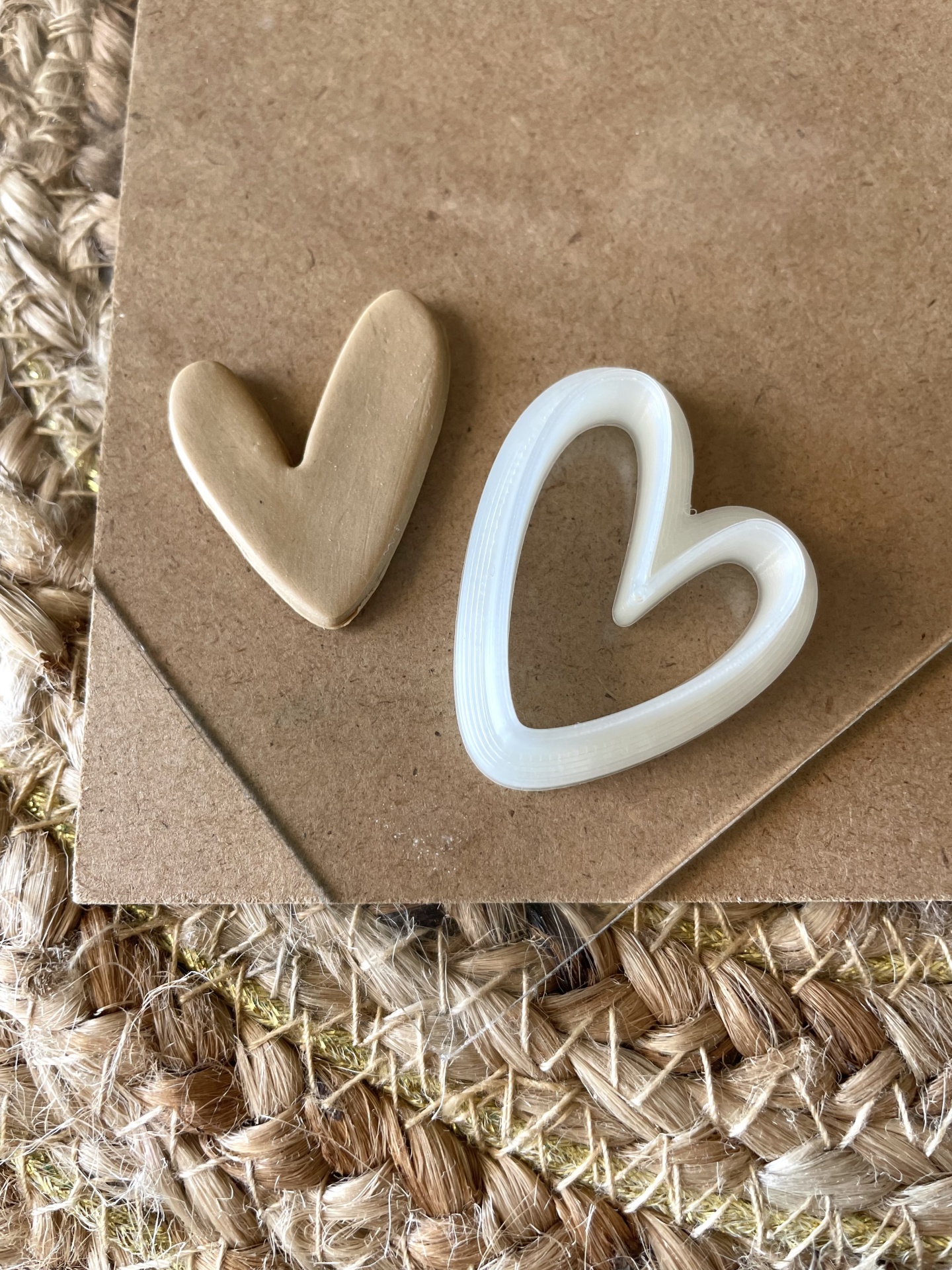 • Dois corações em materiais diferentes sobre papel castanho e tapete de fibras naturais