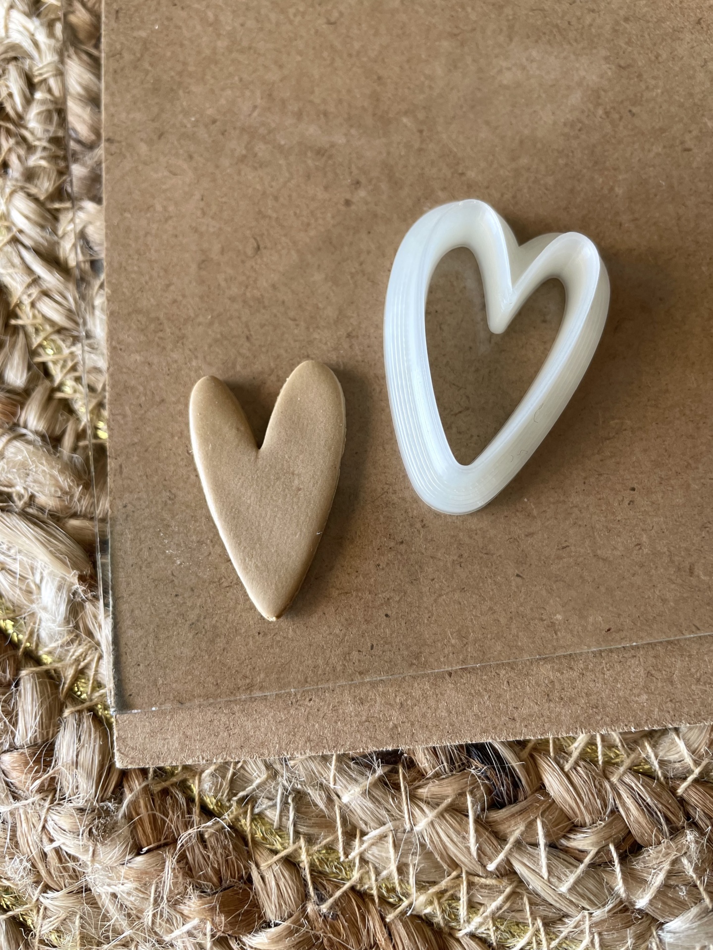 Dois cortadores de coração, um castanho e outro branco oco, sobre cartão e tapete de fibras naturais