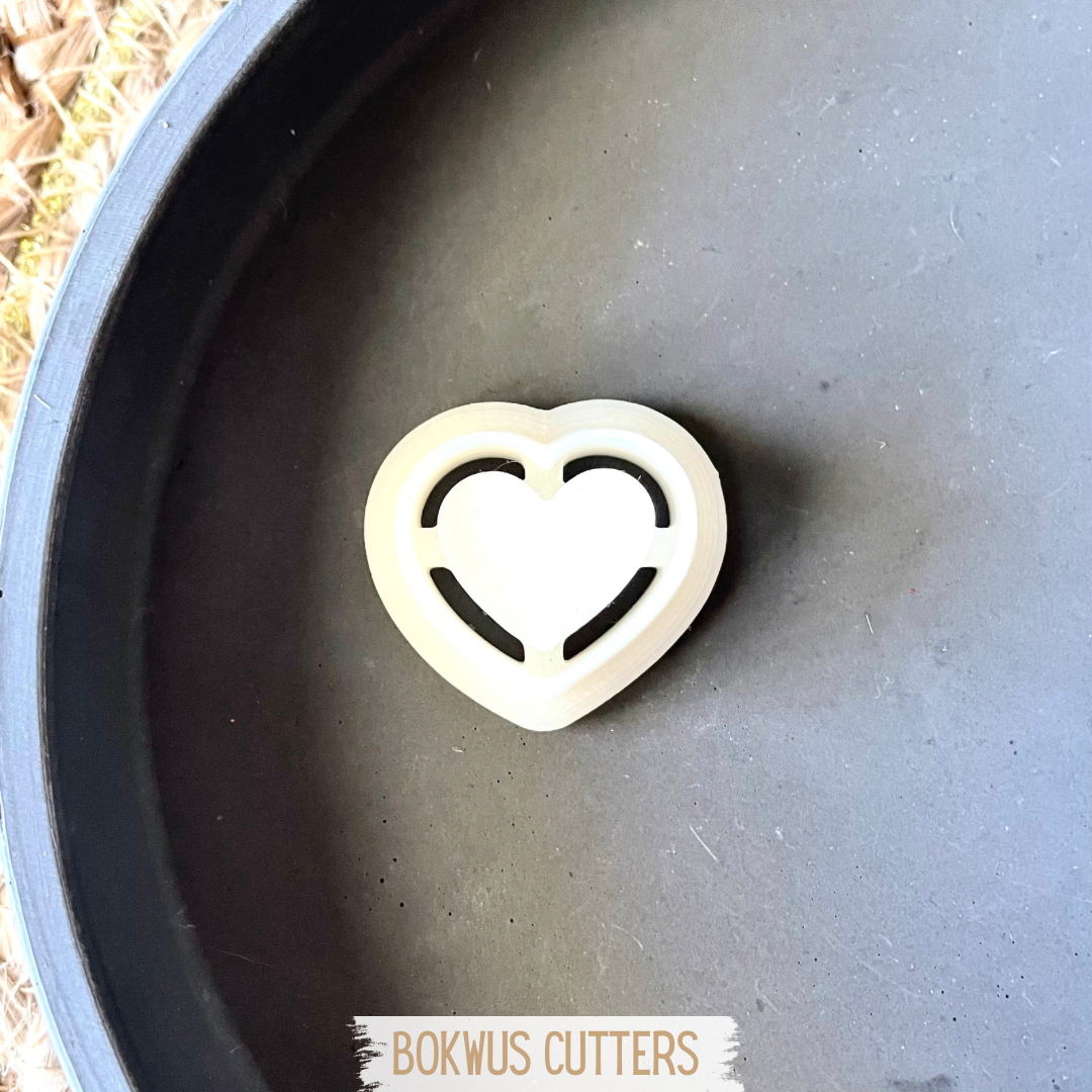 • Cortador de biscoitos em forma de coração branco numa bandeja preta