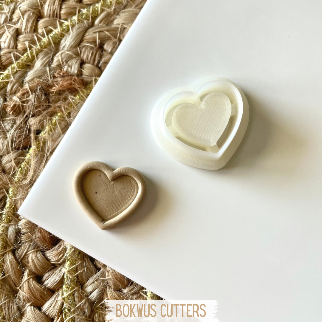• Cortador de biscoitos em forma de coração branco com molde de madeira sobre base branca e tapete de fibras naturais