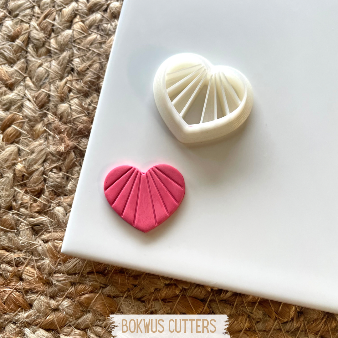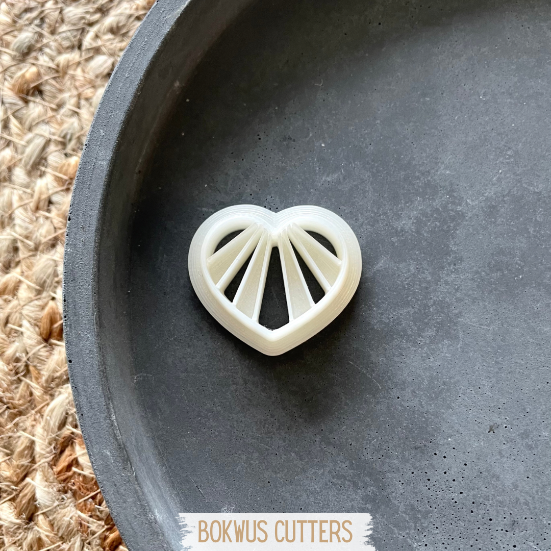 • Cortador de pastelaria em forma de coração branco com divisões internas, sobre base preta e tapete de fibras