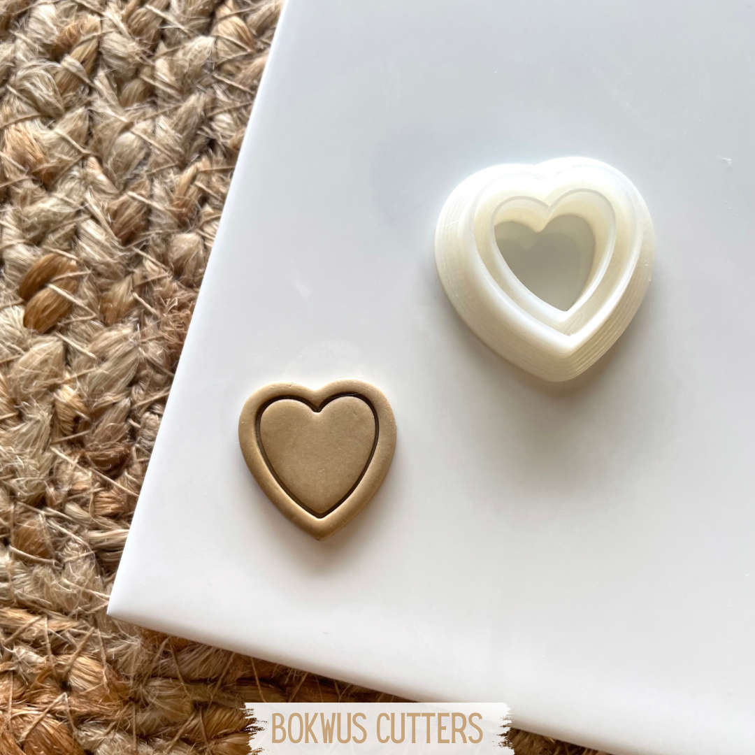 • Cortador de biscoitos coração branco e biscoito coração sobre superfície branca e fundo trançado