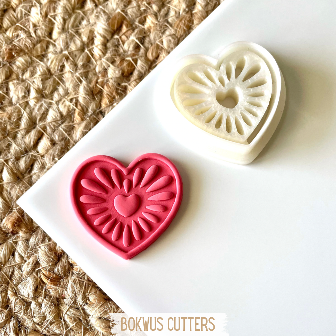 • Dois cortadores de coração vermelho e branco com padrão interno sobre prato branco.