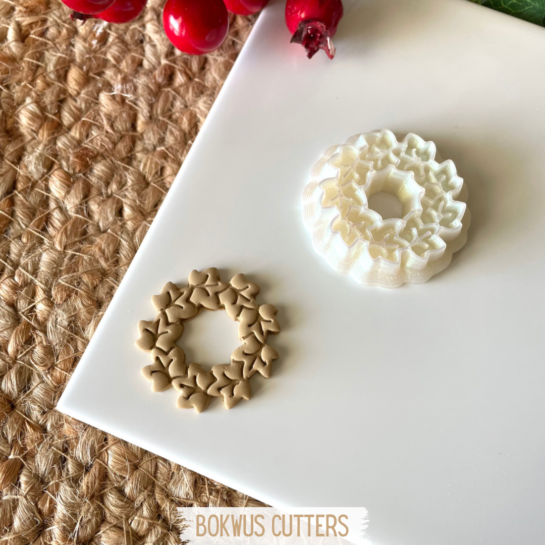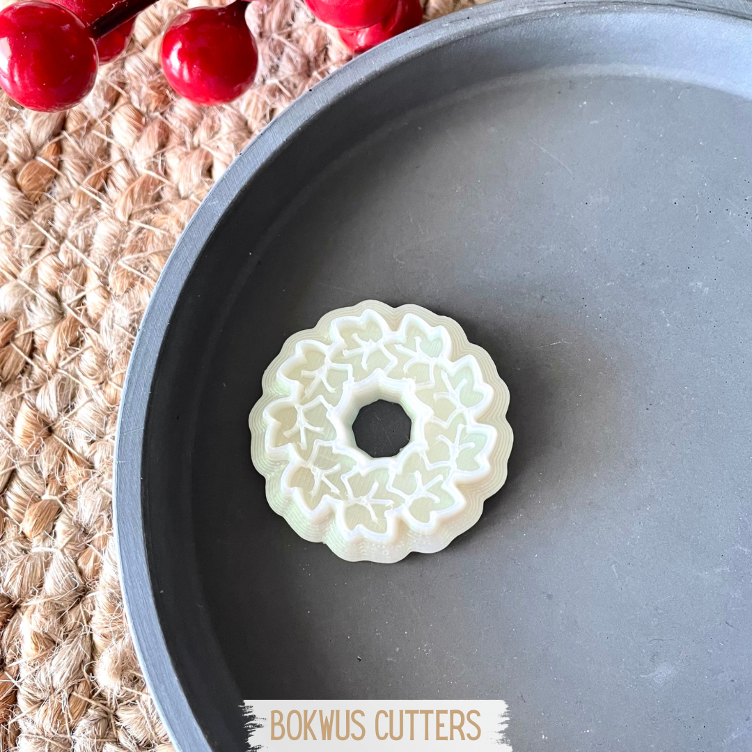 • Cortante para bolachas branco com padrão de folhas sobre prato cinza e fundo de tecido trançado com bagas vermelhas.