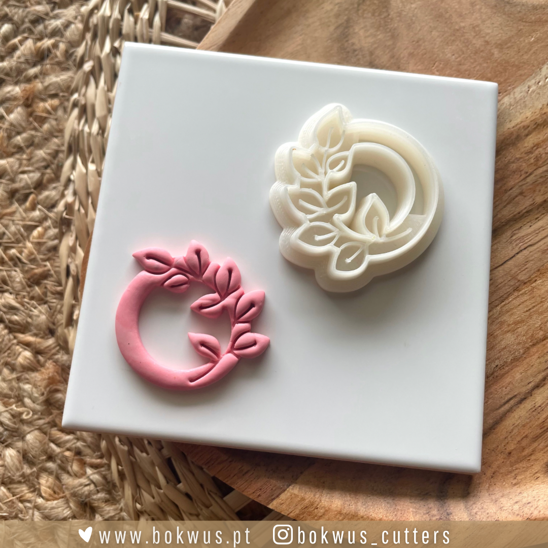 • cortador de bolachas circular branco com ramos de folhas ao lado de impressão rosa sobre placa branca e madeira