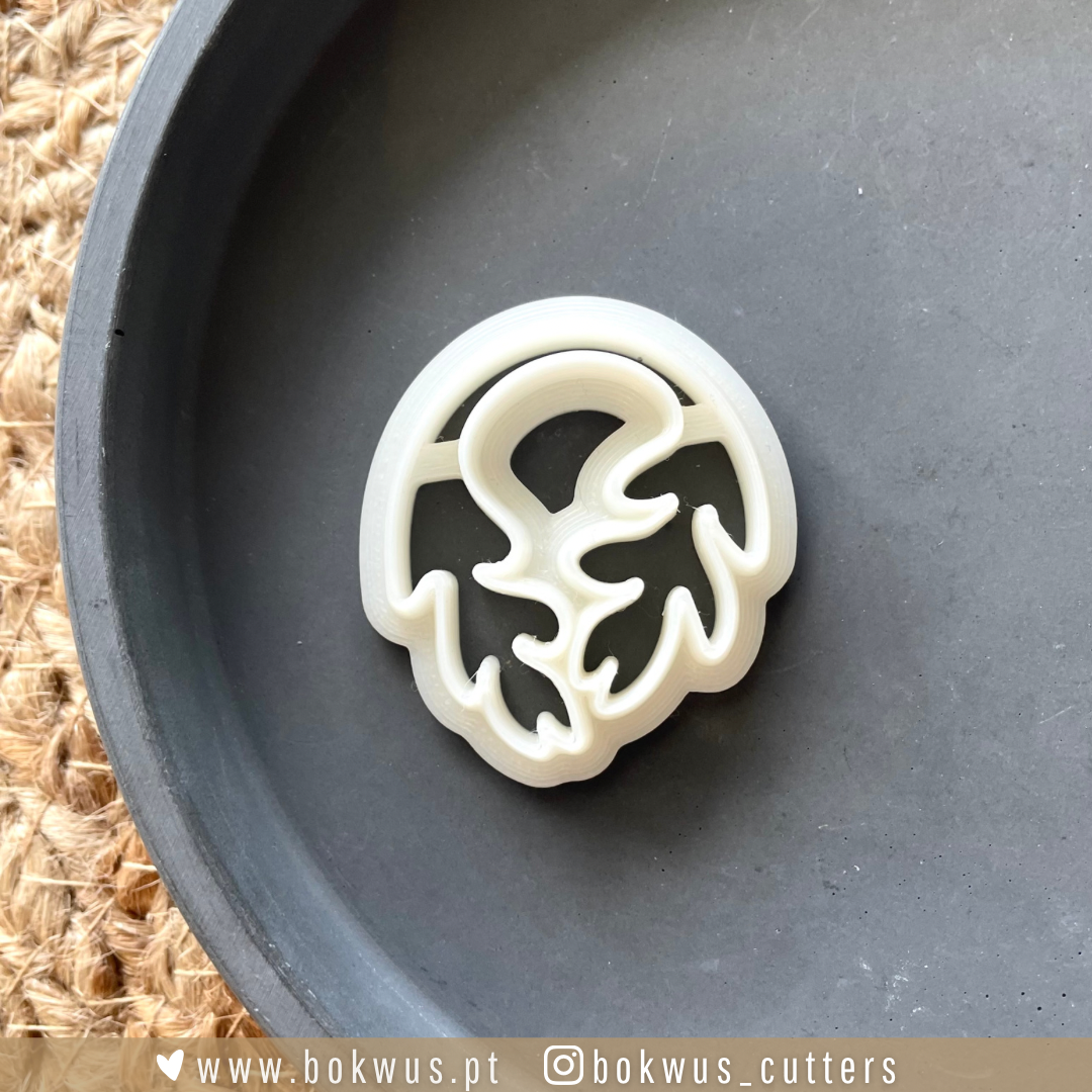 • Cortador de biscoitos branco em forma de folha numa travessa cinza sobre tapete de fibras naturais