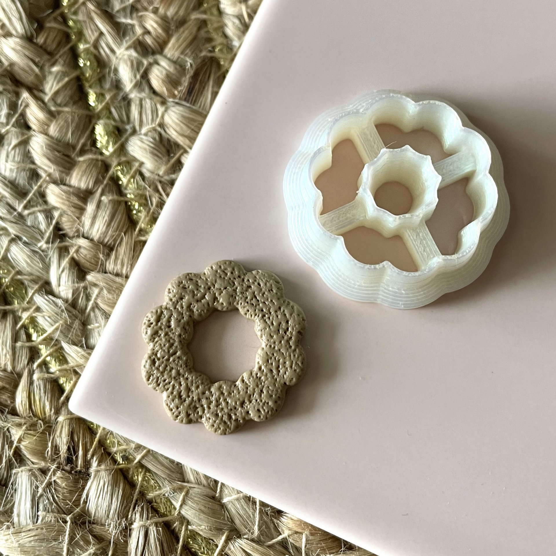 • Cortador de massa branco em forma de flor com peça de massa texturizada cortada ao lado