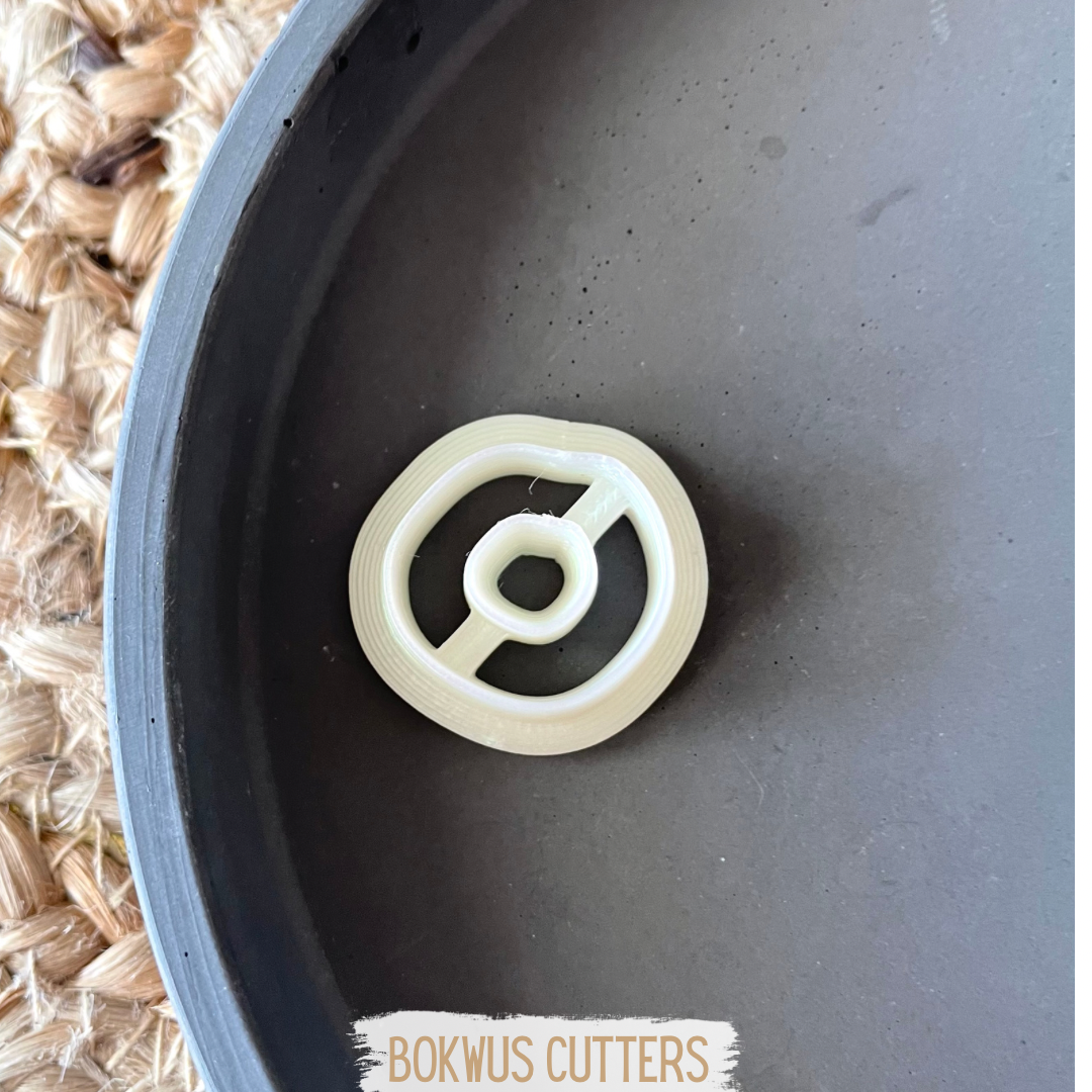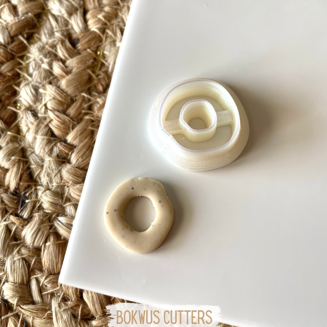 • Cortador de massa branco em forma de anel irregular ao lado de massa crua cortada, sobre superfície branca com pano trançado.