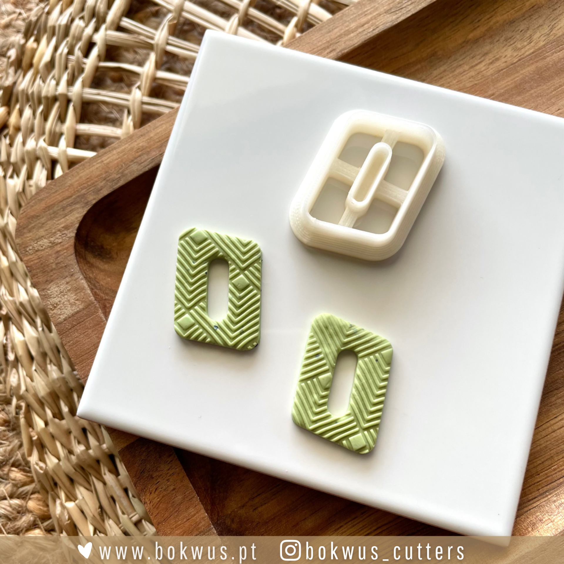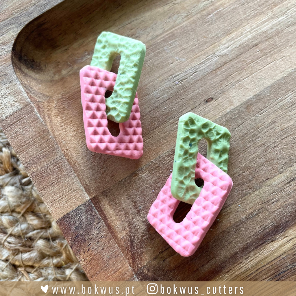 • Par de brincos verdes e rosa com textura quadrada em relevo