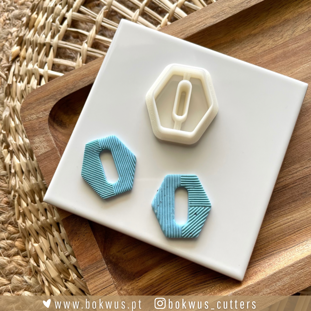 Três cortadores de biscoitos hexagonais com diferentes padrões, numa placa branca sobre bandeja de madeira