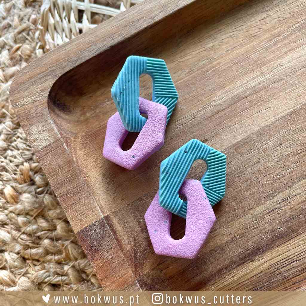 • Brincos geométricos azul e rosa sobre tabuleiro de madeira
