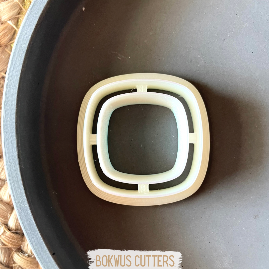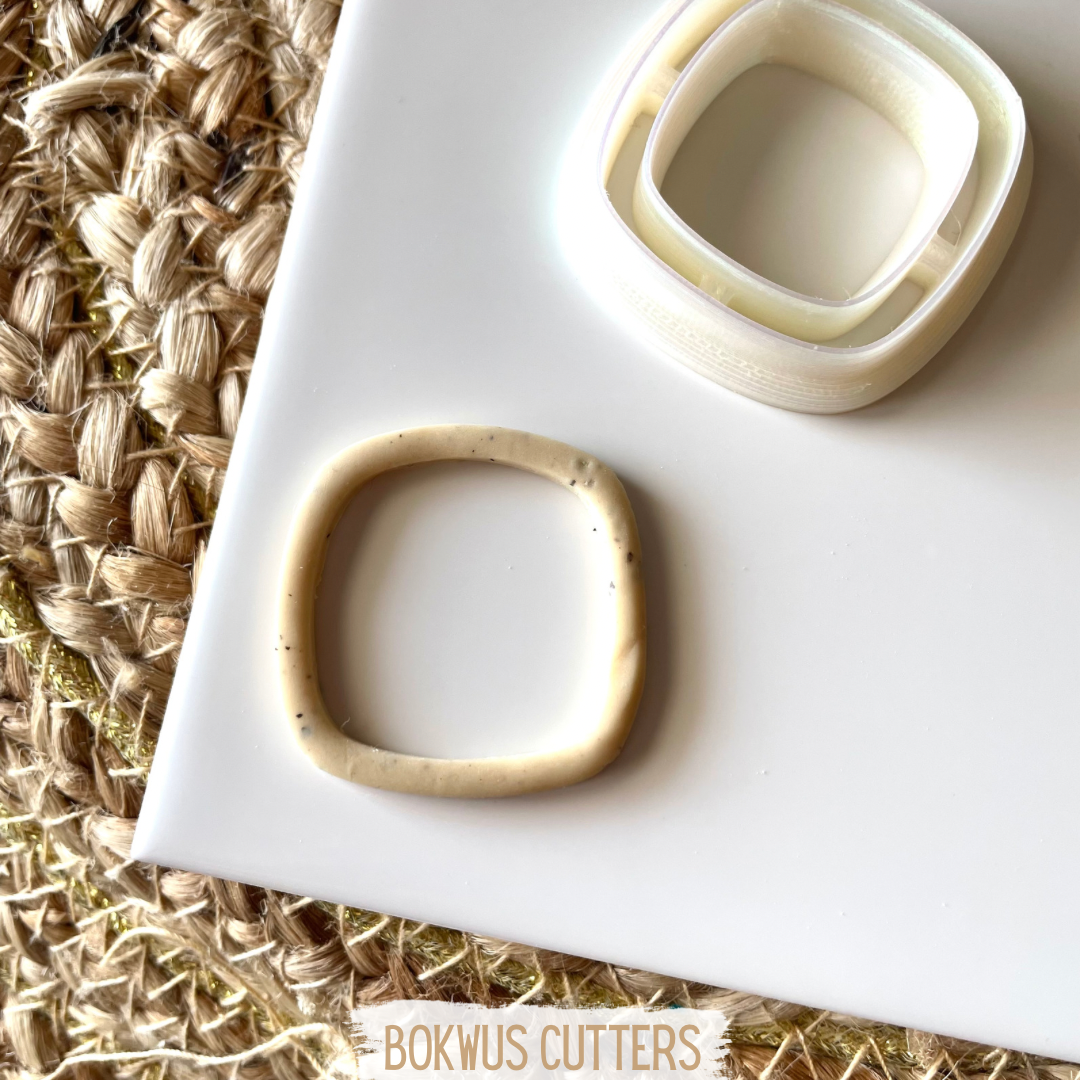 • Cortador quadrado branco em plástico sobre base branca e tecido rústico castanho