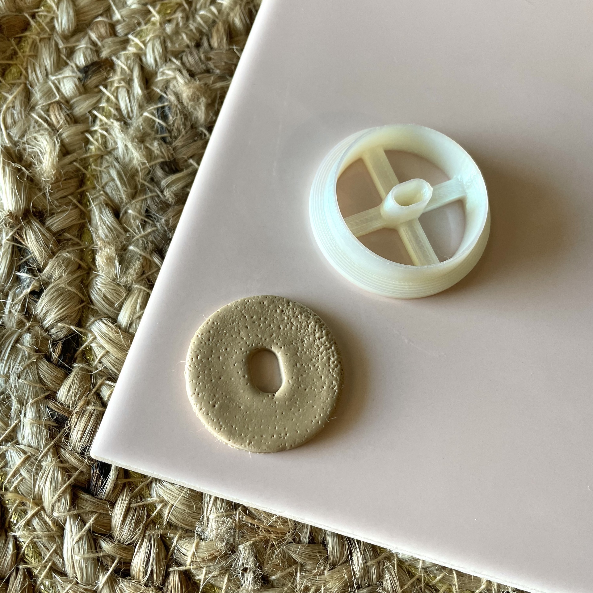 Superfície rosa claro com disco creme e peça plástica branca sobre superfície de corda trançada.