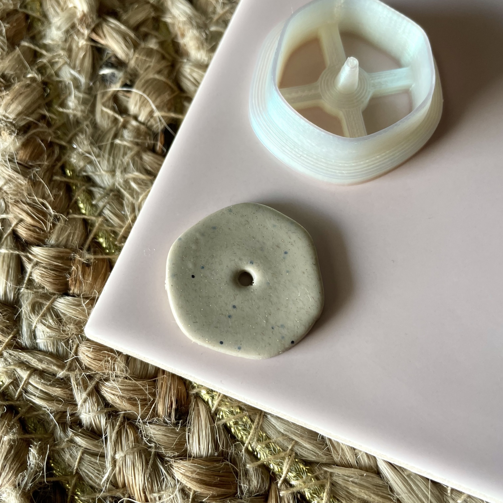 • Botão cinza claro com manchas pretas ao lado de objeto plástico branco numa superfície rosa sobre tecido de corda entrelaçada