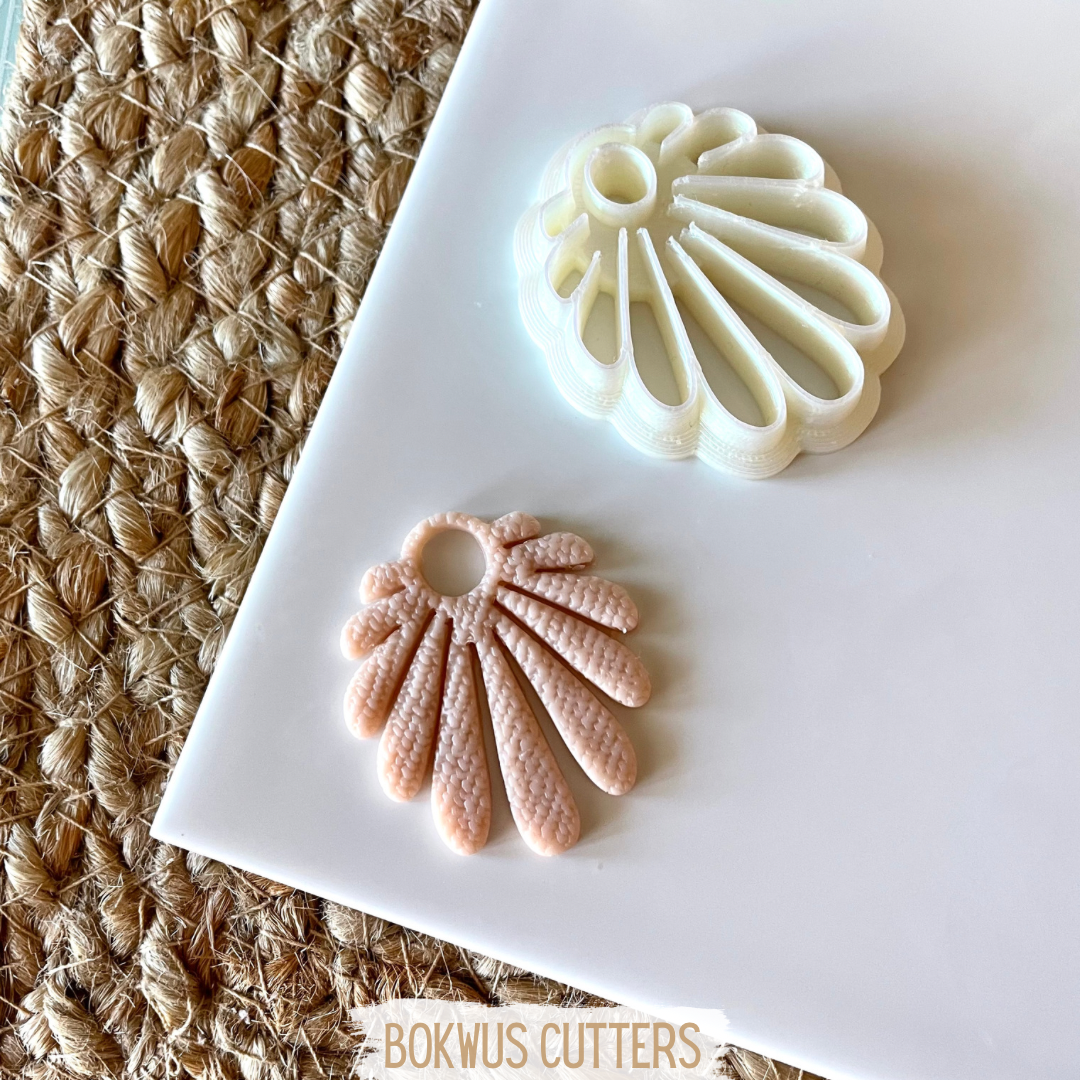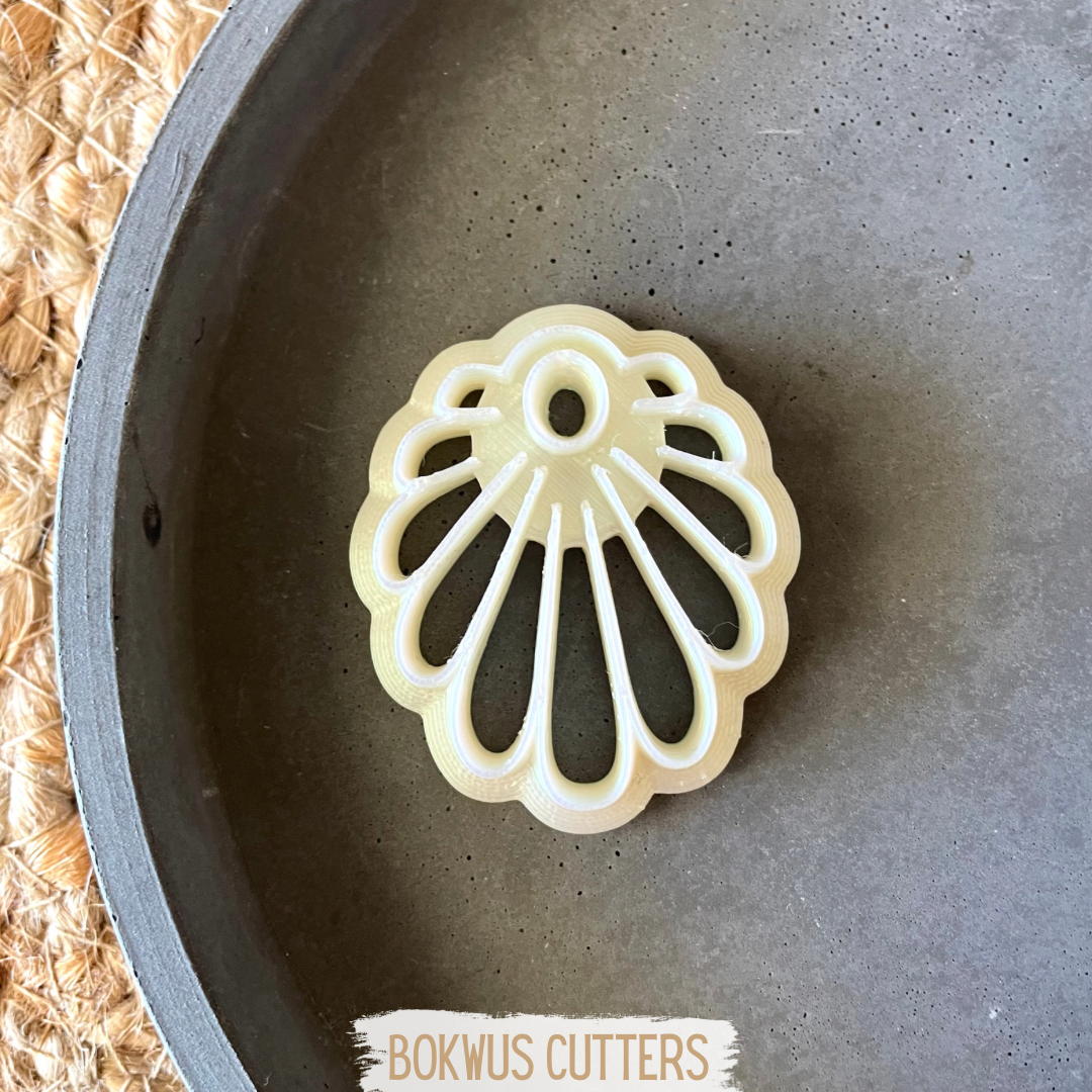 • Forma cortadora de concha branca em plástico e peça rosa texturizada sobre tabuleiro branco com tapete de fibra natural e texto BOKWUS CUTTERS.