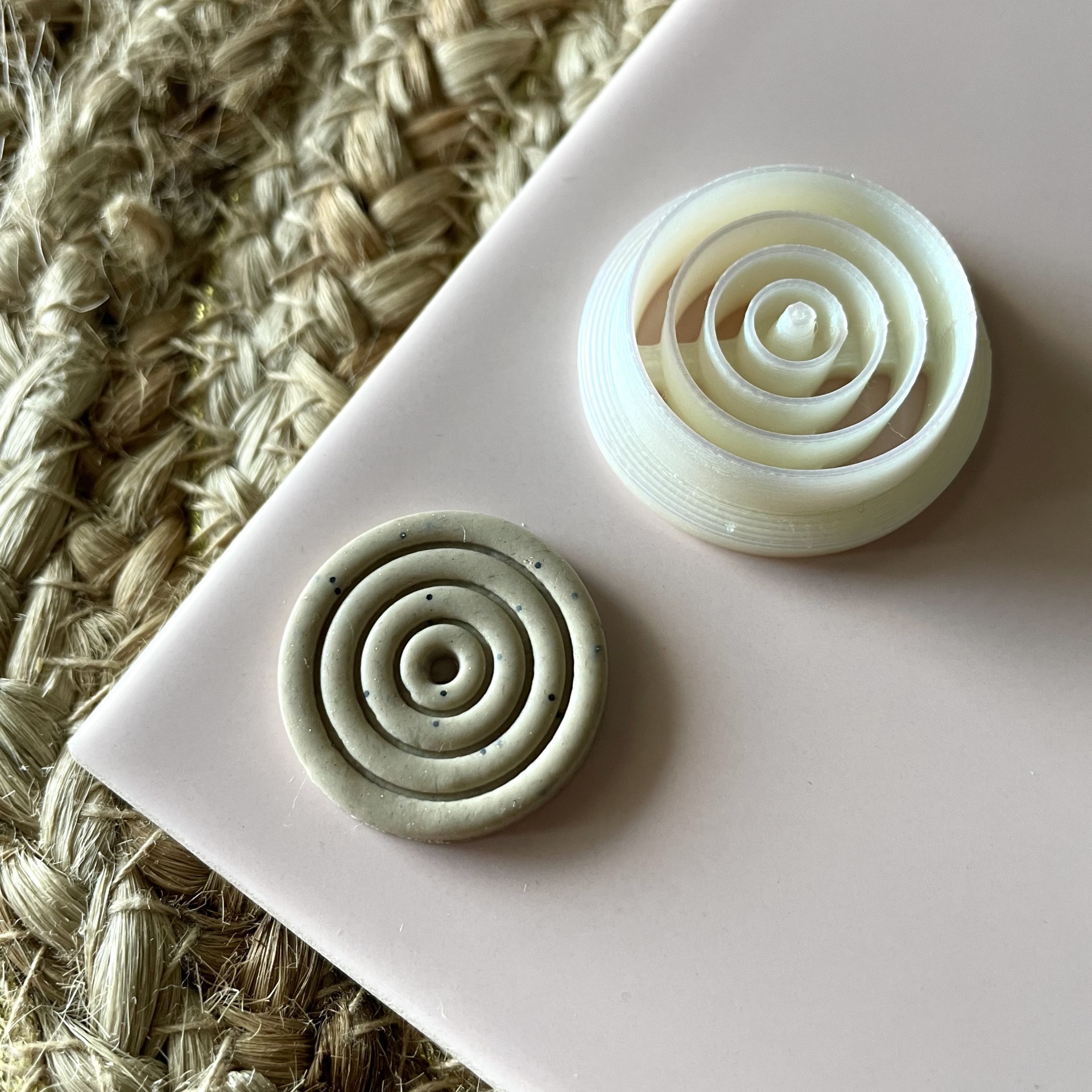• Dois objetos redondos com padrão concêntrico em espiral sobre base rosa e tapete de fibras trançadas