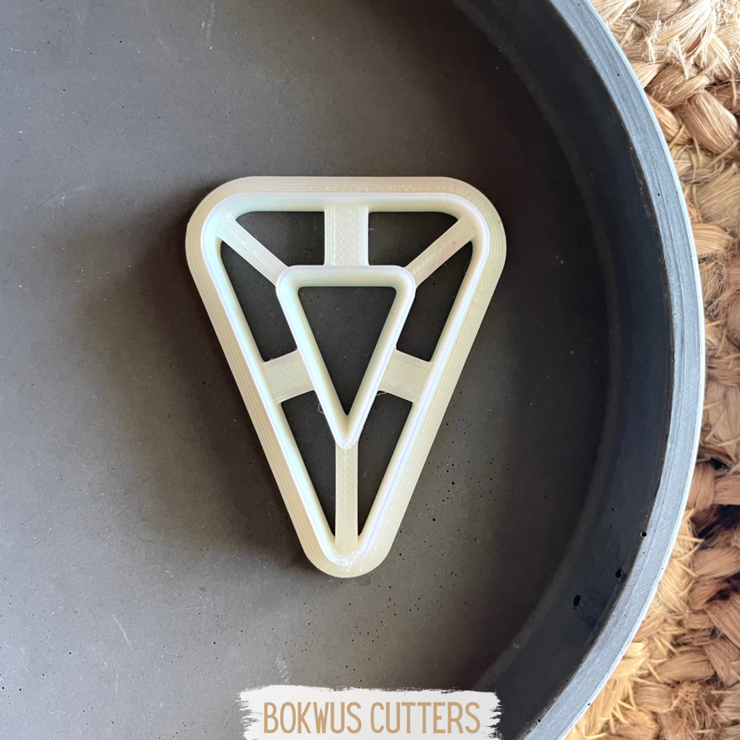 Cortador triangular branco dentro de frigideira preta sobre superfície de palha