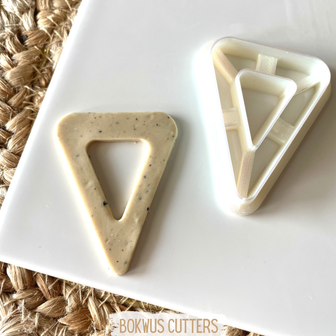 • Cortador triangular branco em plástico junto a massa bege com partículas sobre superfície branca