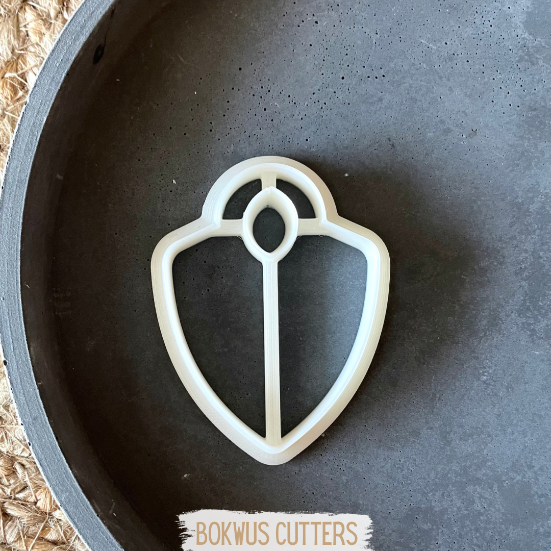 • Cortador de bolachas em formato de escudo branco sobre fundo cinzento e palha