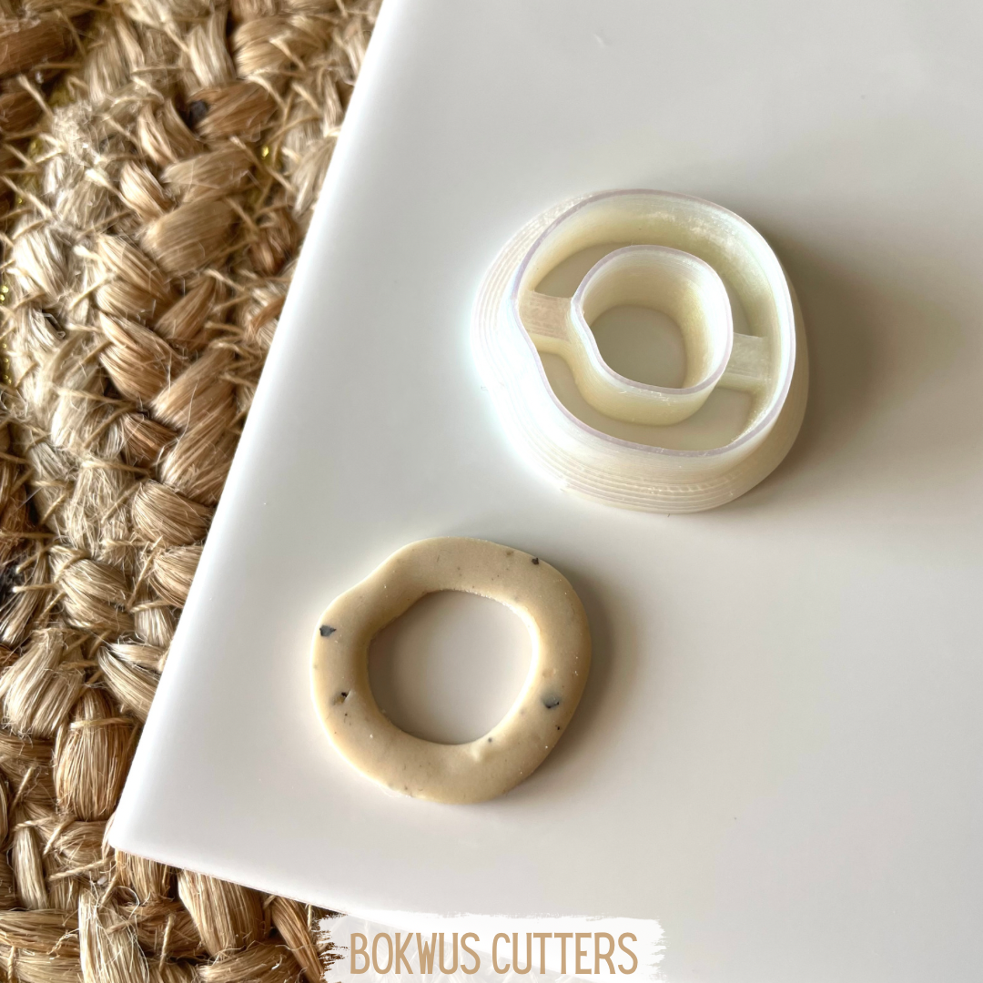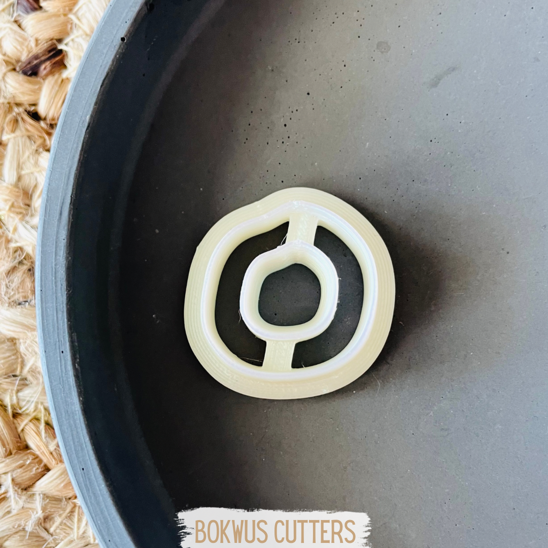 • Cortador de biscoitos plástico branco com formato irregular numa superfície preta