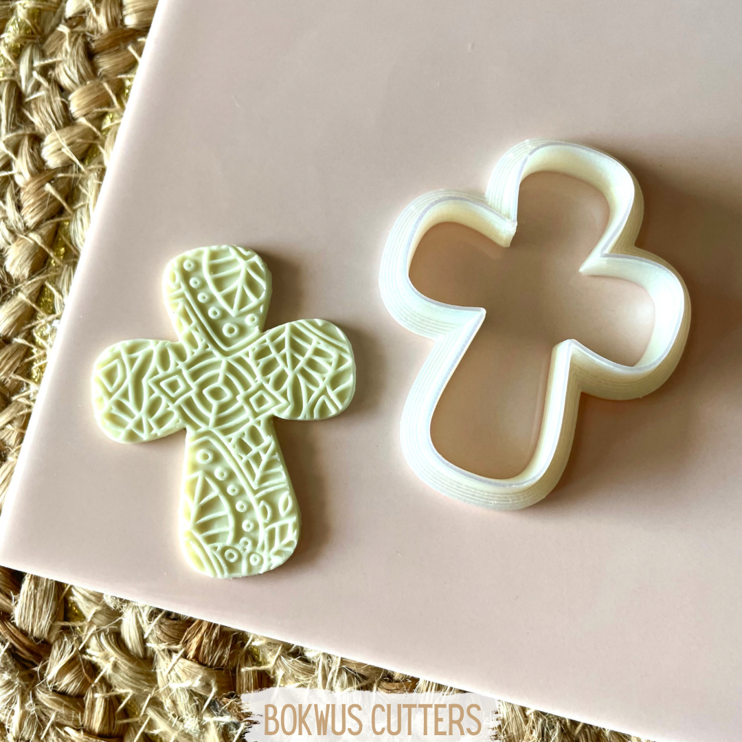 • Conjunto de cortador de biscoitos em forma de cruz com padrão geométrico, em plástico branco e creme, sobre superfície rosa e tapete de fibras