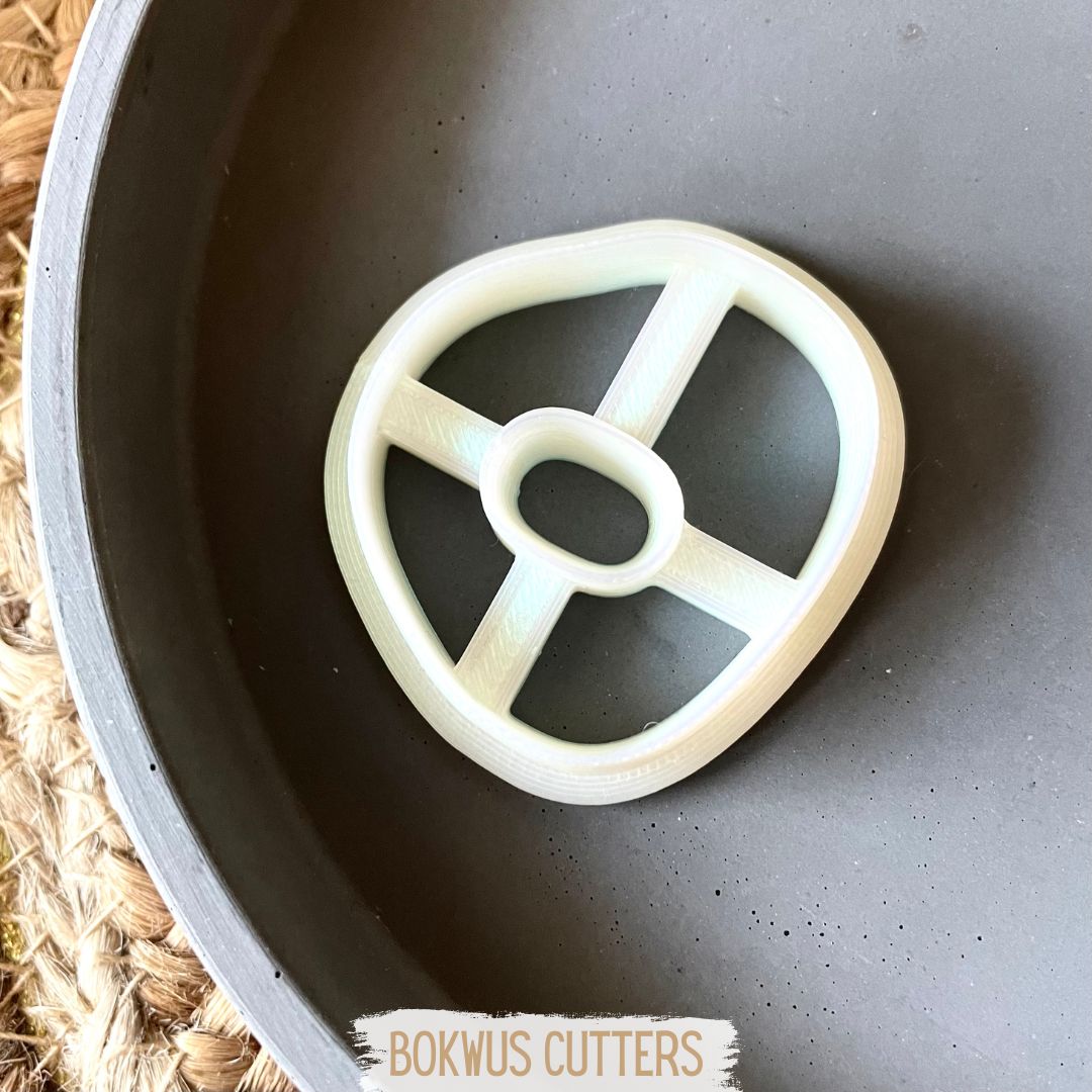 • Cortador de massa de plástico branco com quatro secções em prato cinzento.