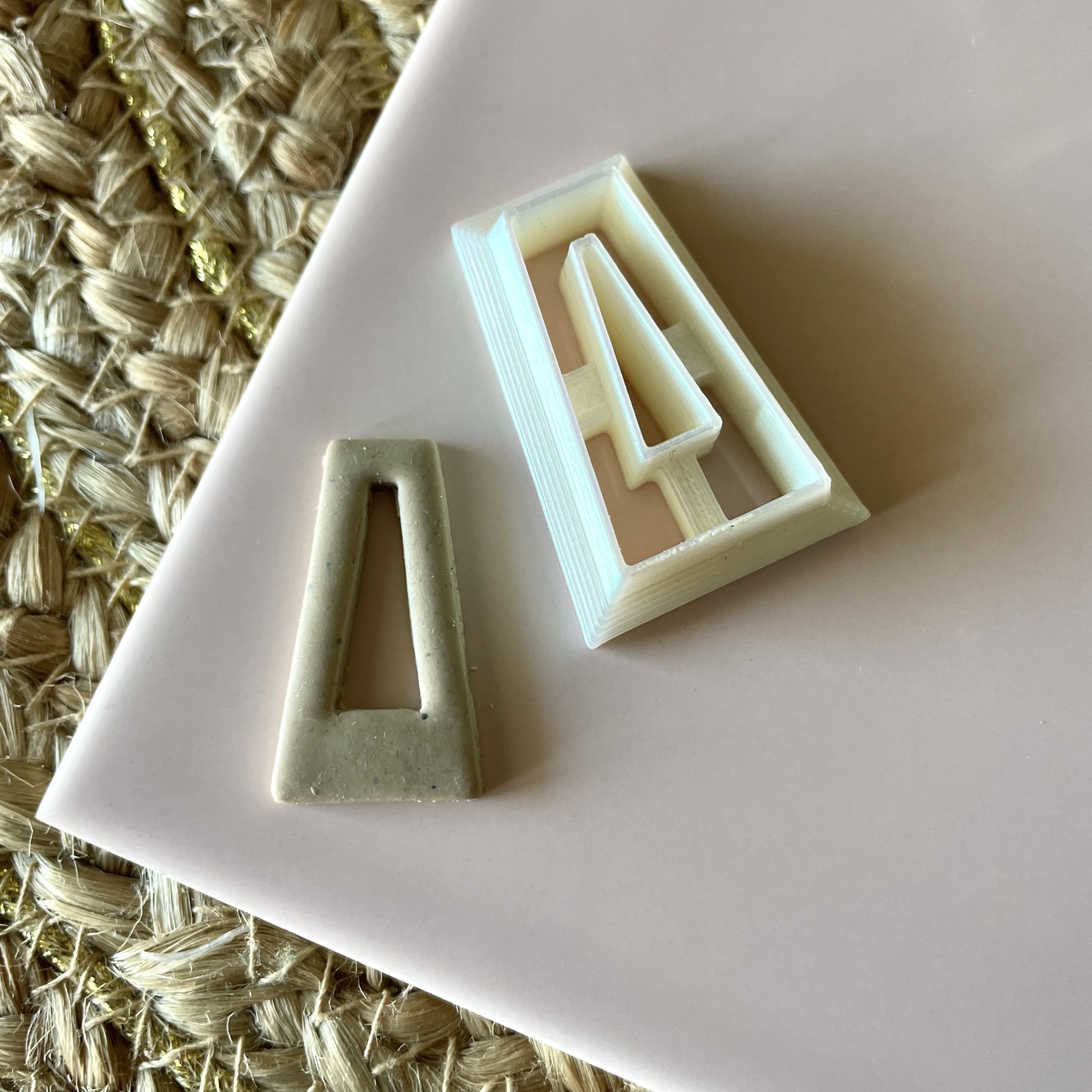 • Molde de plástico branco e uma peça de massa cinza claro em forma triangular sobre superfície rosa e tapete de corda.